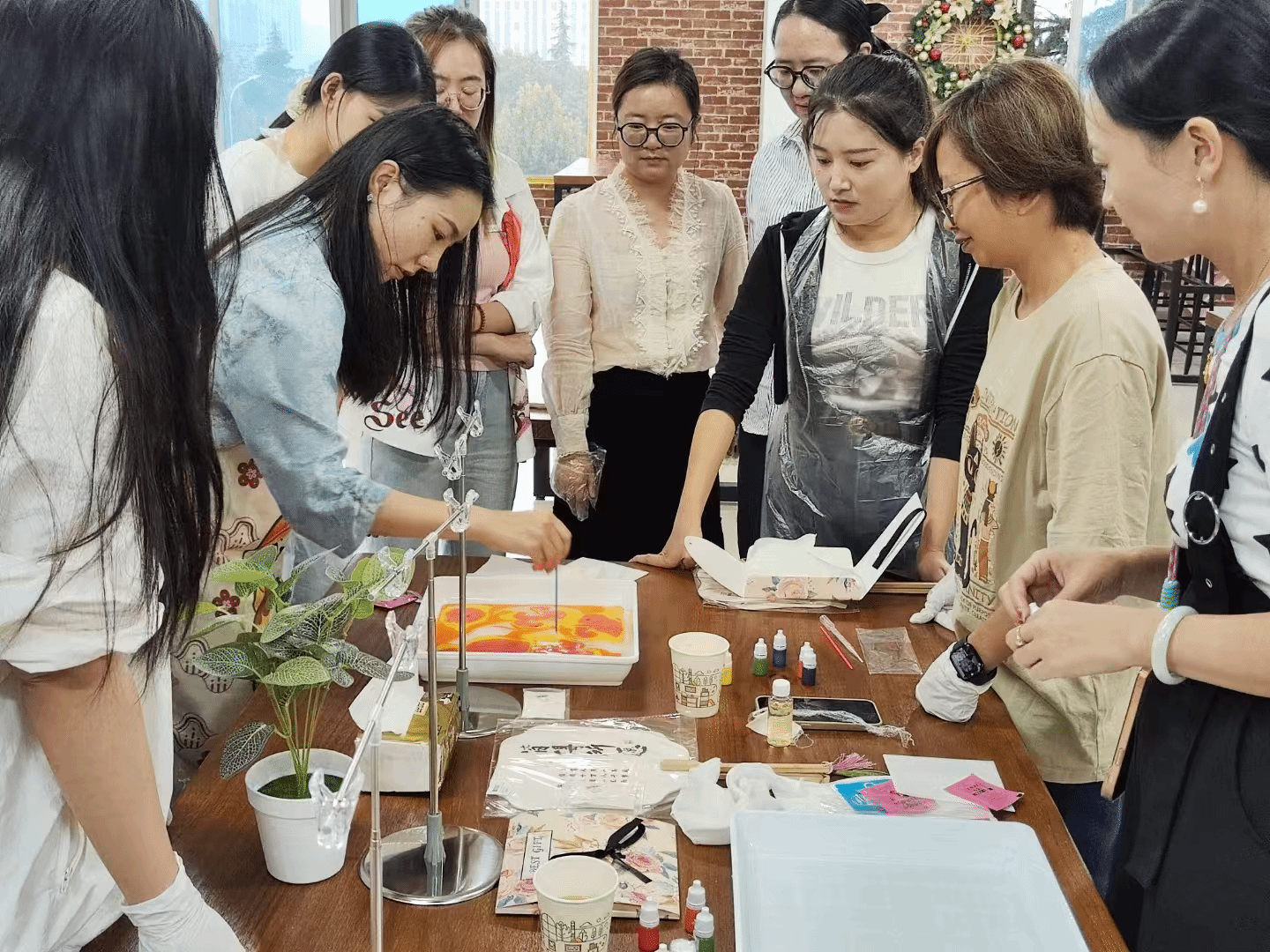 在刘老师的悉心指导下,教师们纷纷拿起画笔与工具,投入到艺术创作中。她们用心感受颜料的流动与融合,用心描绘属于自己的艺术篇章。水拓丝巾上的图案渐渐成形,漆扇上的画面也愈发精美。在这一过程中,教师们不仅学会了制作技艺,更体会到了艺术创作的乐趣与成就感。