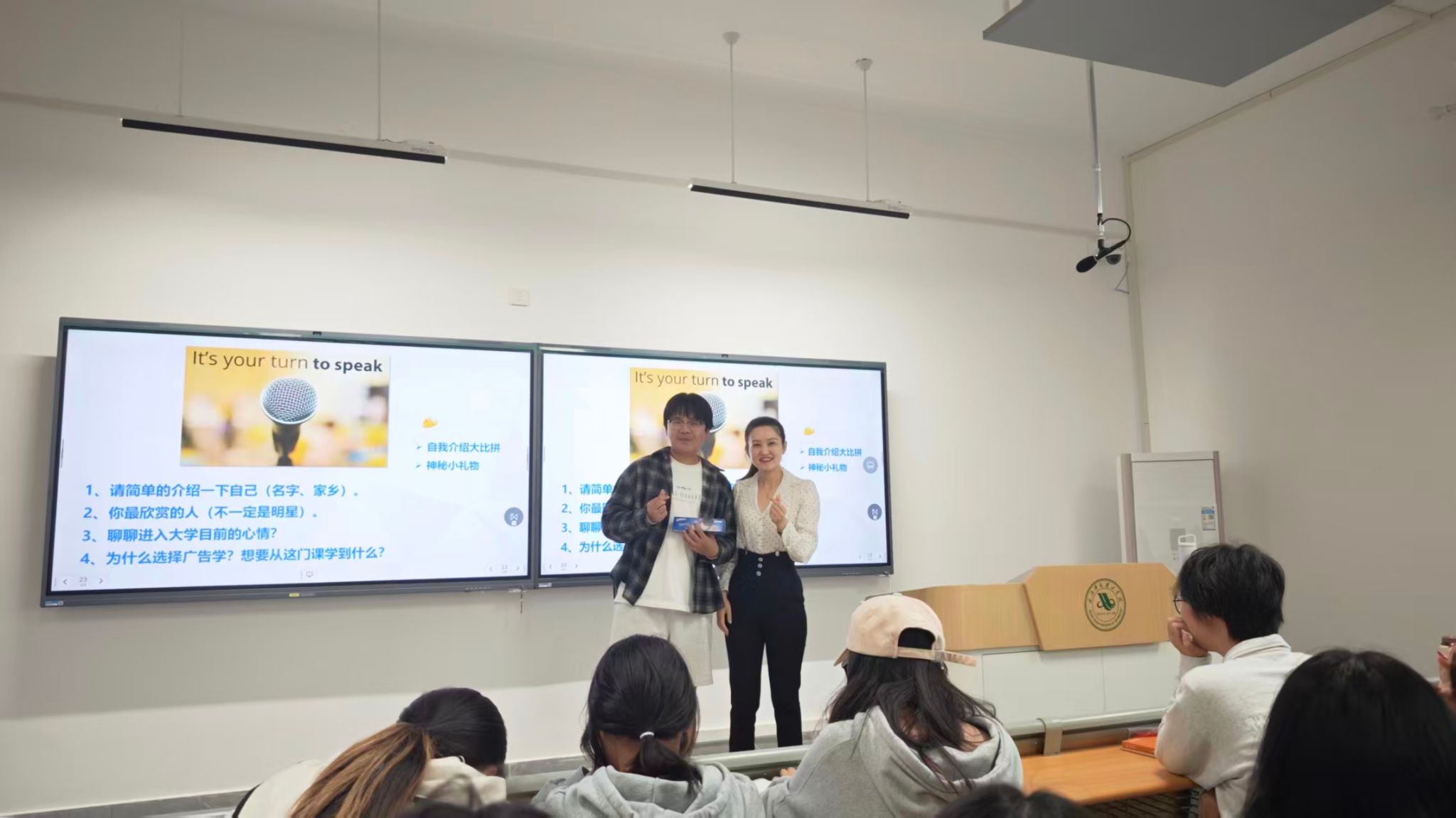 随后,课堂进入了轻松愉快的“破冰”环节。新生们虽略带青涩,但都勇敢地上台,逐一介绍自己的姓名、家乡、欣赏的人以及想从这门课学到的内容。从“觉得广告无处不在”到“想成为创意高手”,一个个质朴而真诚的发言,展现了新生们对未知领域的好奇与憧憬,教室里不时响起会心的笑声与鼓励的掌声。黄蓉老师还精心地为大家准备了小礼物,送给自我介绍让大家印象最深刻的同学。