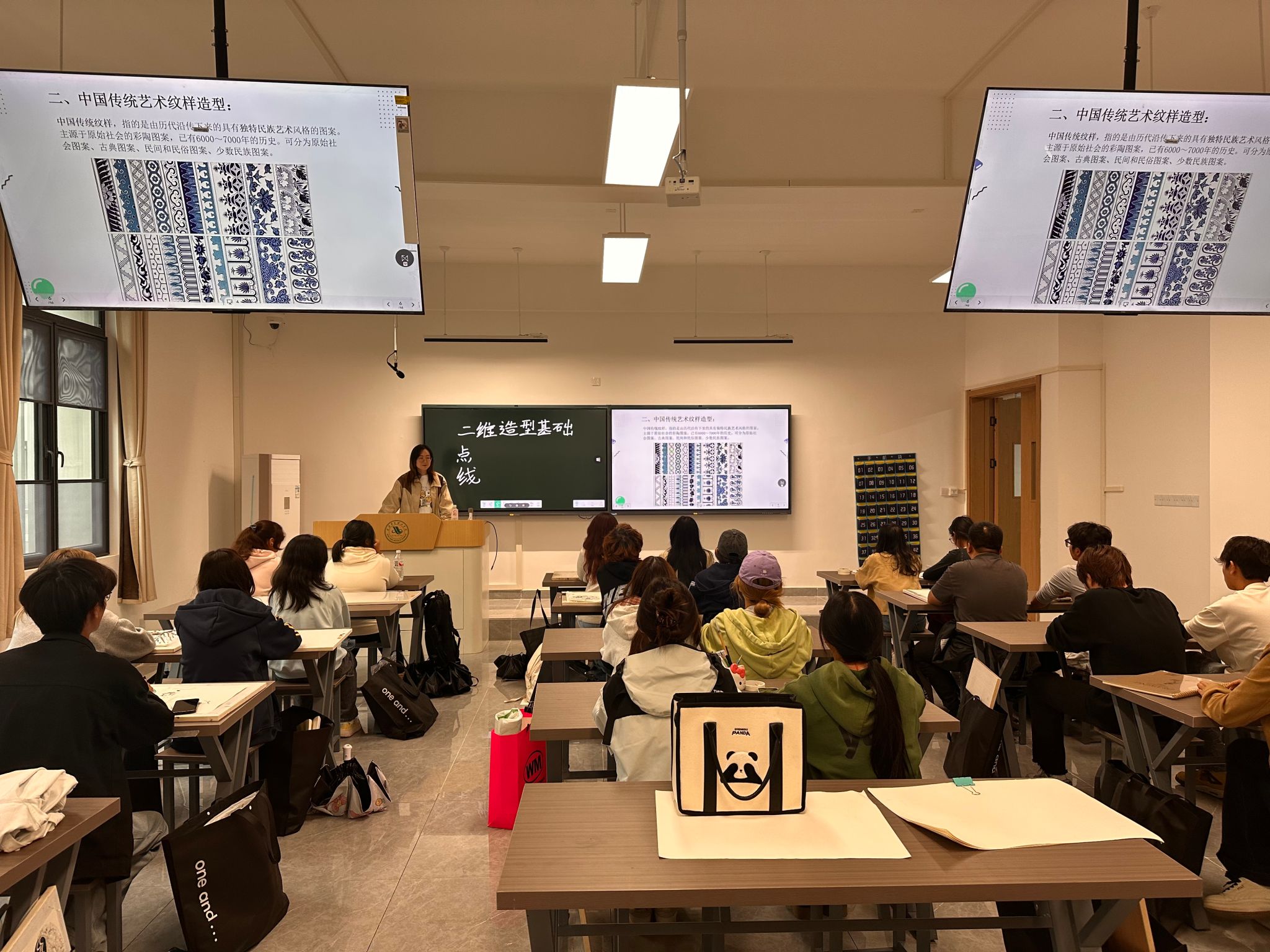课堂上,史慧洁老师以“传统纹样的历史脉络与文化内涵“为核心,系统讲解原始社会、古典、民间民俗、少数民族等的经典纹样。教学中,不仅讲解纹样的造型规律(如对称、重复、渐变等平面构成法则),更深入挖掘其背后的历史故事与文化寓意,引导学生理解纹样中蕴含的吉祥和谐传统理念。