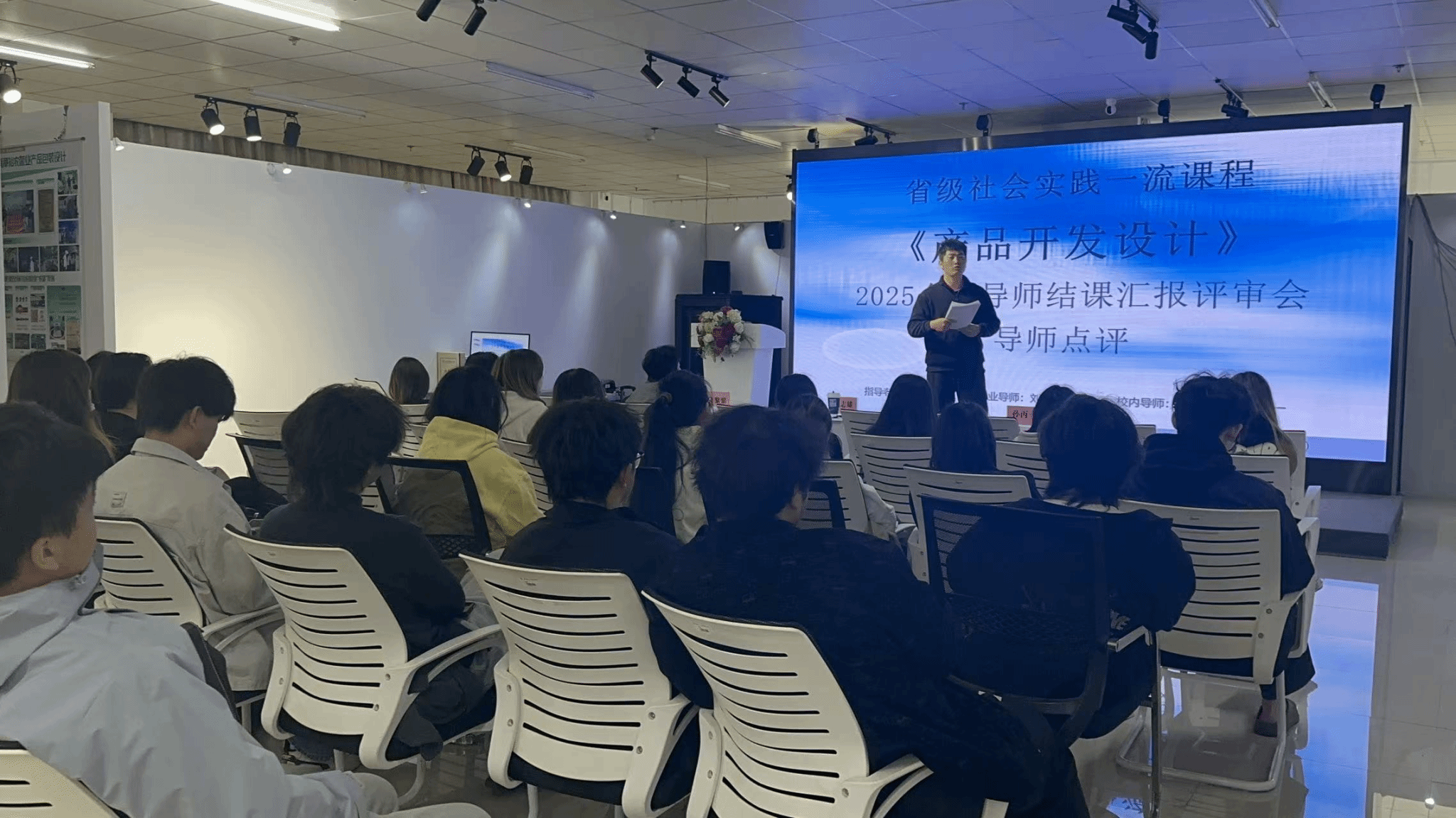 为进一步深化教学改革,展示实践成果,10月23日上午8时,产品设计1231班在艺术馆三楼VR实验室,举办省级社会实践一流课程《产品开发设计》结课评审汇报会。本次会议由课程负责人王晶老师主持,特邀企业导师刘志雄,以及产品系副主任朱琦老师、鲁黎黎老师、孙丙一老师共同担任评审,产设1231班全体同学积极参与并展示丰硕学习成果。