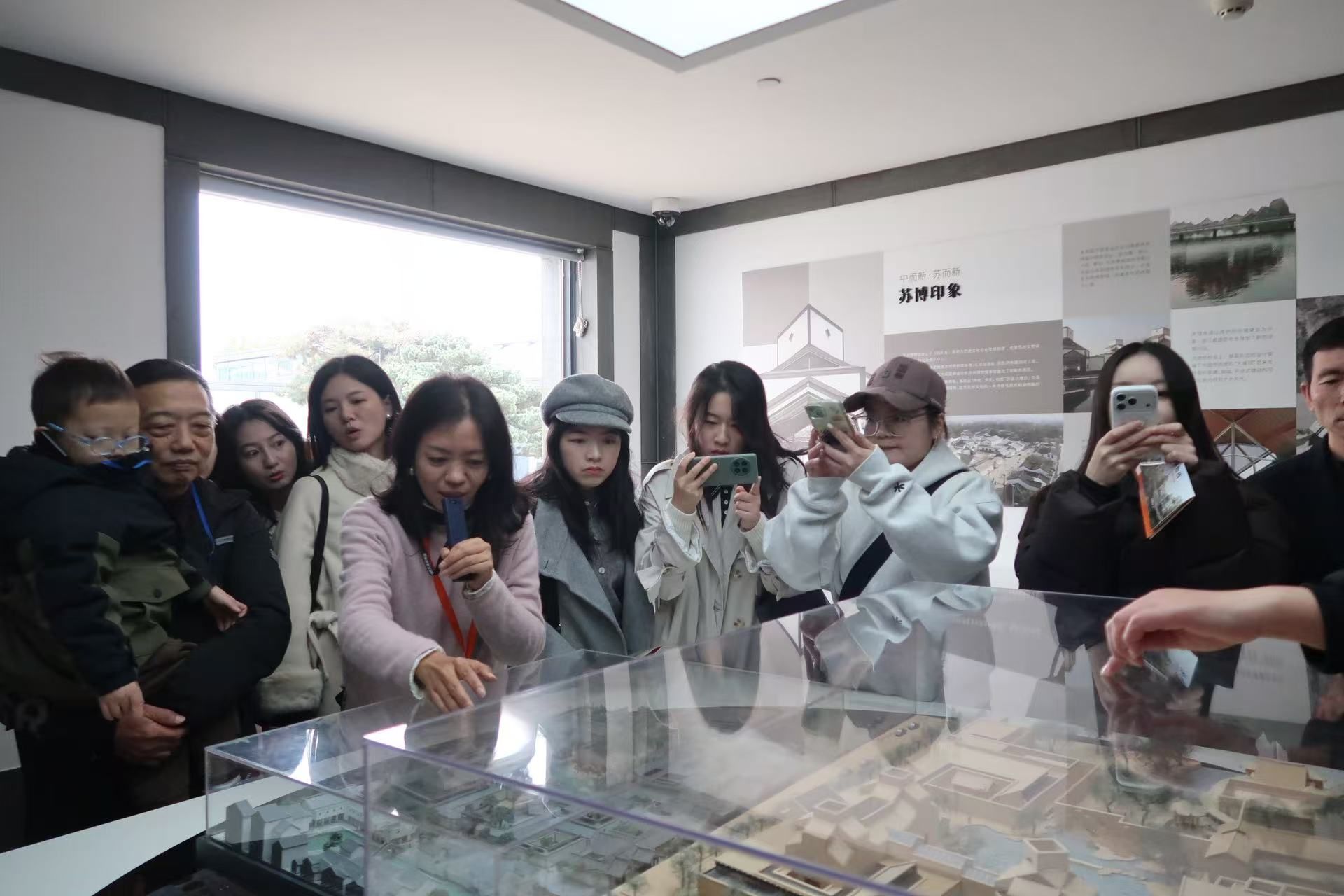 苏州博物馆兼具古典意蕴与现代美学,既是传统文化的载体,更是设计艺术的典范。考察中,教师团队先后参观了馆内书画厅、工艺厅、民俗厅等展区,细品历代书法墨迹的笔墨神韵,观摩传统工艺美术品的精巧肌理,研读民俗文物中的视觉符号,深入领略苏绣的细腻针法、园林纹样的对称韵律、文人器物的极简美学,精准捕捉传统视觉元素的文化内核与艺术特质。同时,教师团队重点研习了苏州博物馆建筑本身的设计巧思,贝聿铭先生将江南园林的留白、借景手法与现代建筑的简洁线条相融,白墙黛瓦的色彩搭配、光影错落的空间布局、虚实相生的视觉层次,尽显东方美学的独特韵味,为视觉传达设计中的版式构图、色彩运用、空间营造提供了鲜活范本。