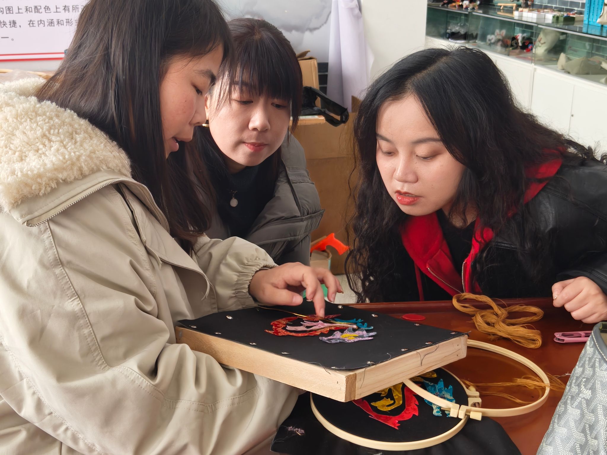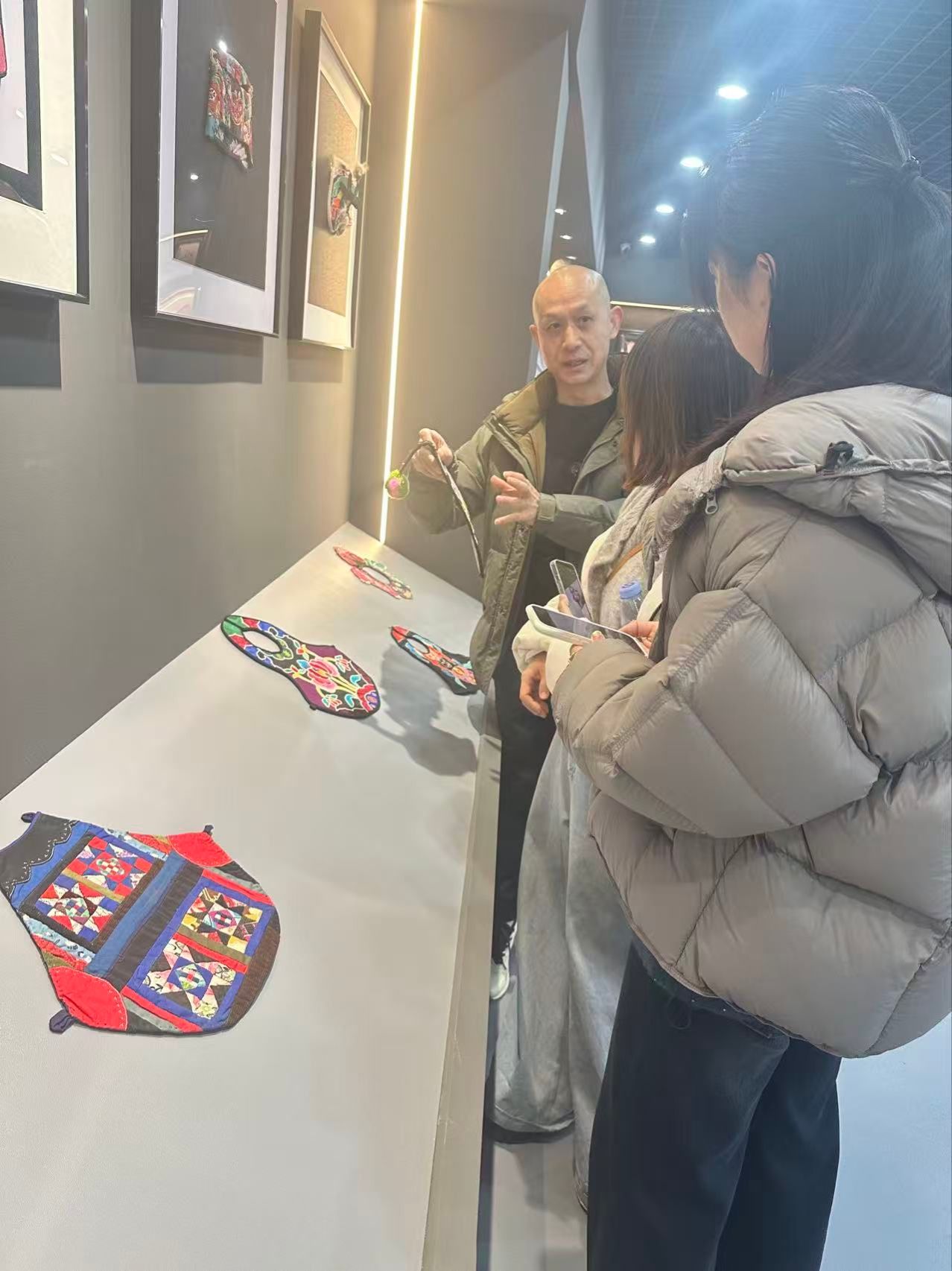 培训期间,我院教师参观了阳新县文化馆内的民俗展厅与阳新布贴专题展厅,通过珍贵的实物陈列与图文资料,系统了解了阳新布贴的历史脉络、地域特色与文化内涵。在随后进行的技艺学习环节,教师们深入体验了阳新布贴从图样设计、剪裁拼贴到缝制完成的全过程。培训班特别邀请了省级非物质文化遗产代表性传承人洪总,以及市级传承人孔老师进行现场教学。两位老师从传统纹样寓意、色彩哲学、工艺技巧到当代创新应用等方面进行了细致讲解与示范,使我院教师不仅掌握了基础技艺,更对非遗活态传承与当代设计转化有了更深层的思考。