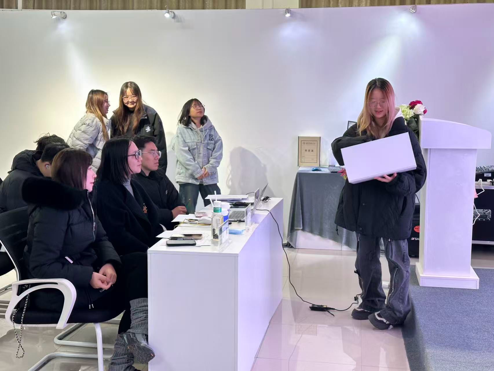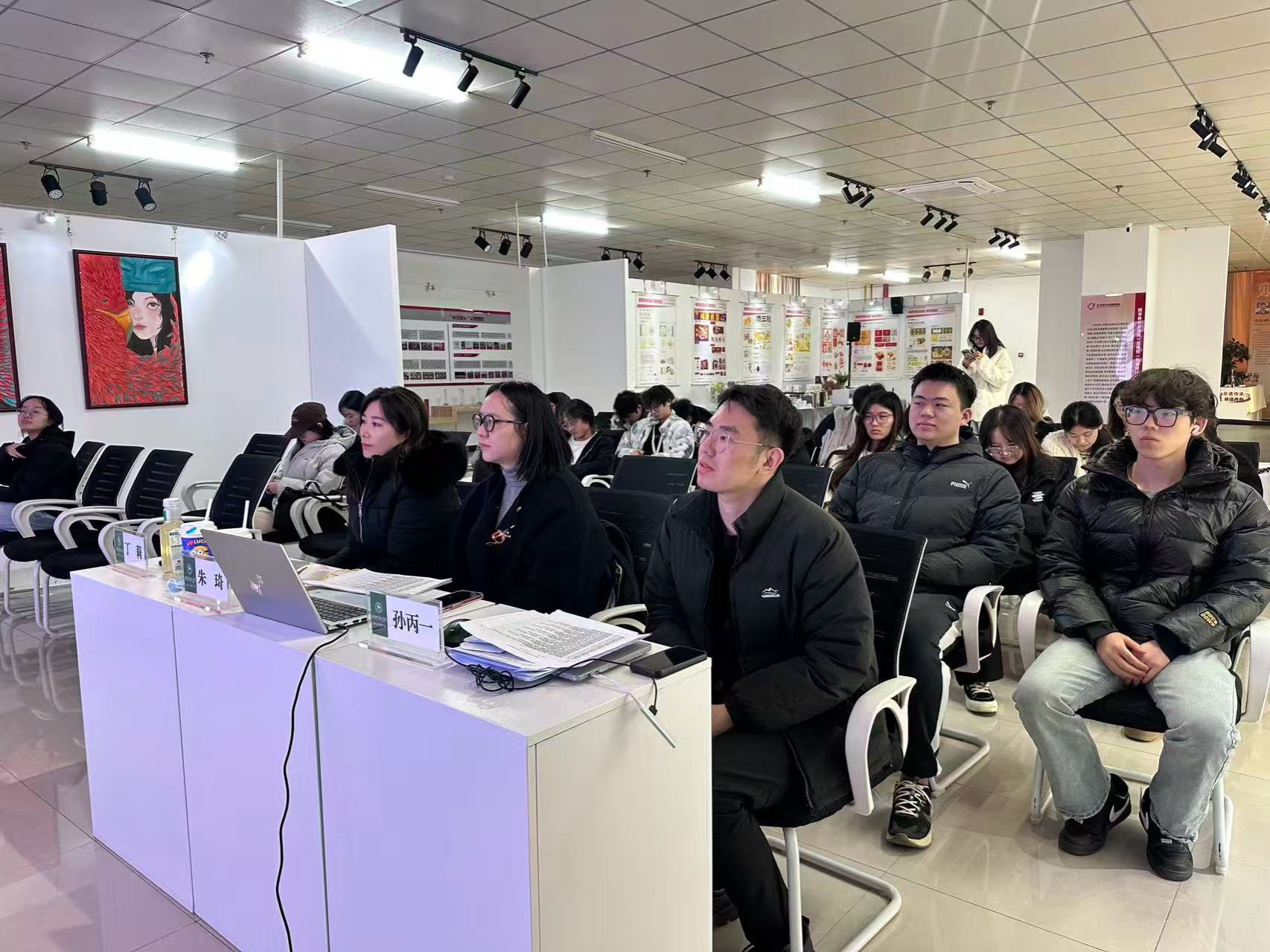 2025年12月18日下午14点,由产品设计系朱琦老师主讲的《展示设计》课程结课汇报暨校企合作项目提案会在艺术馆三楼VR实验室顺利举行。武汉加成医药科技有限公司代表丁莉经理作为企业导师受邀出席,与校内导师孙丙一参与点评产品设计1231班学生的创作成果,聚焦“真题实做”教学模式下的需求转化与设计表达。