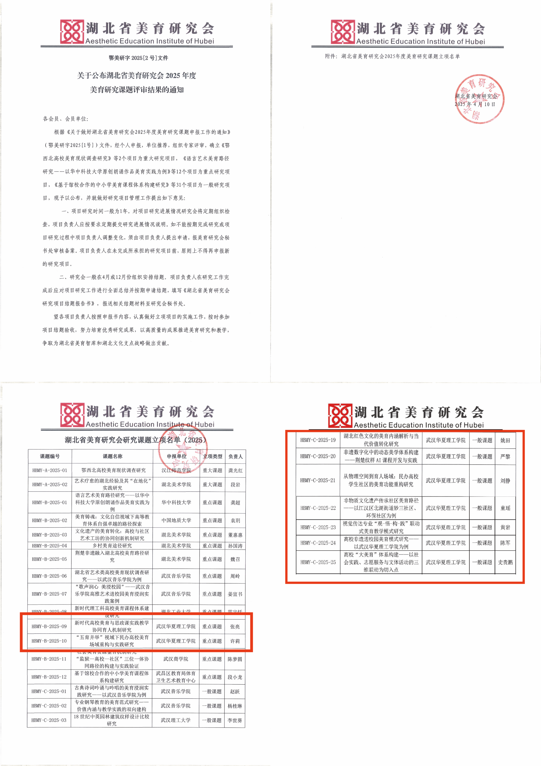 近日,从湖北省美育研究会获悉,本次beat365共获批美育教育教学研究课题9项,其中艺术学院获批8项,同时获批的还有校团委副书记史贵鹏老师申报的课题。