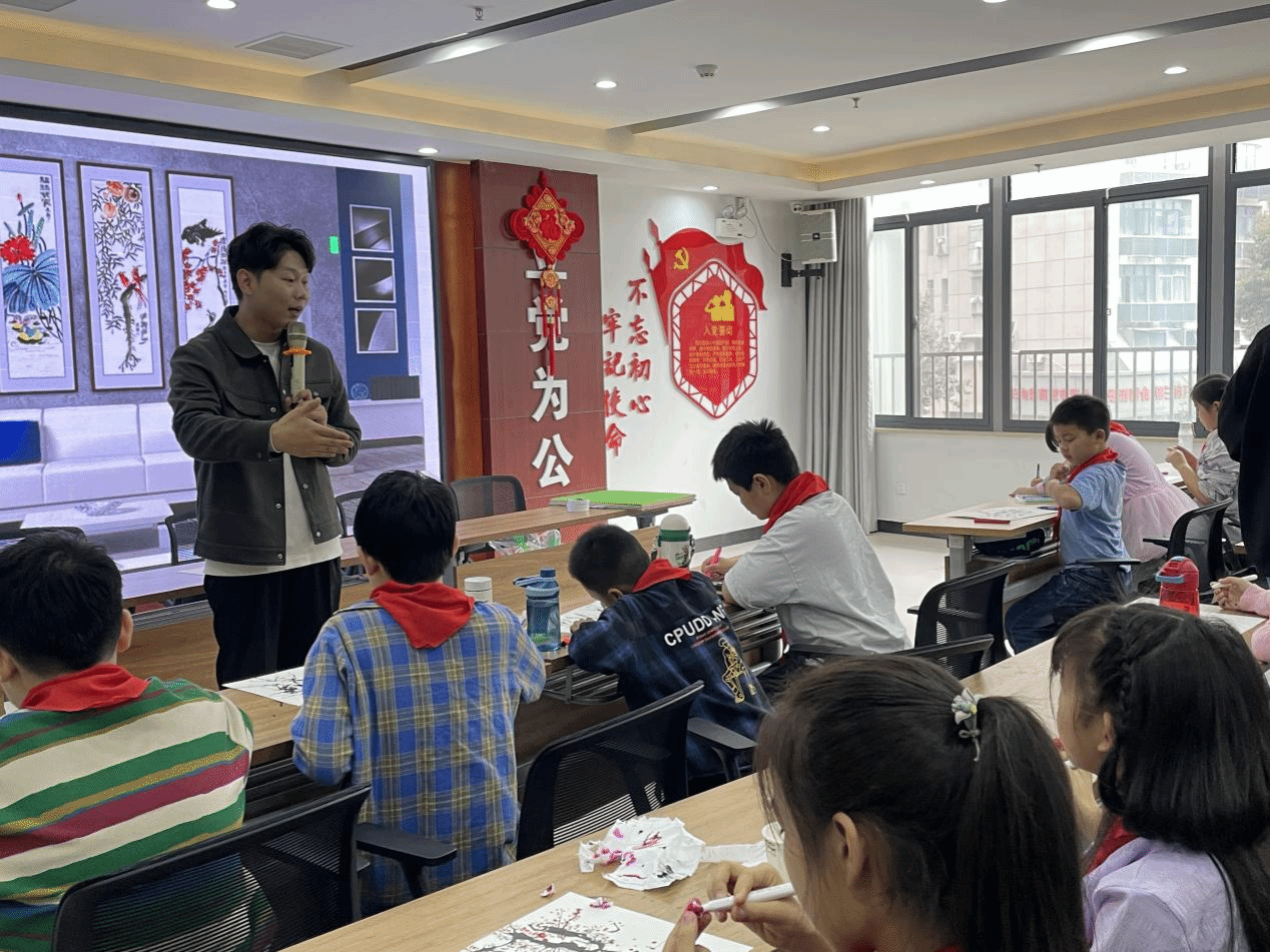 在等待墨水干透的过程中,陈军老师又通过问答互动的方式,讲述了中国古代的条屏。条屏是中国书画的一种竖式形制,单独悬挂的称为条幅,并挂的称为条屏或堂屏。条屏与中堂、横披、扇面、斗方、手卷、镜心等共同丰富了中国画的陈设与欣赏形式。小朋友们都听的很认真并积极的回应老师提出的问题。了解条屏相关知识让更多青少年儿童了解条屏在我们生活中的运用。通过对不同条屏风格的欣赏了解条屏的多样性。课堂中同学们非常认真地了解了吹墨和条屏的制作方法以及梅花的表现方式。
