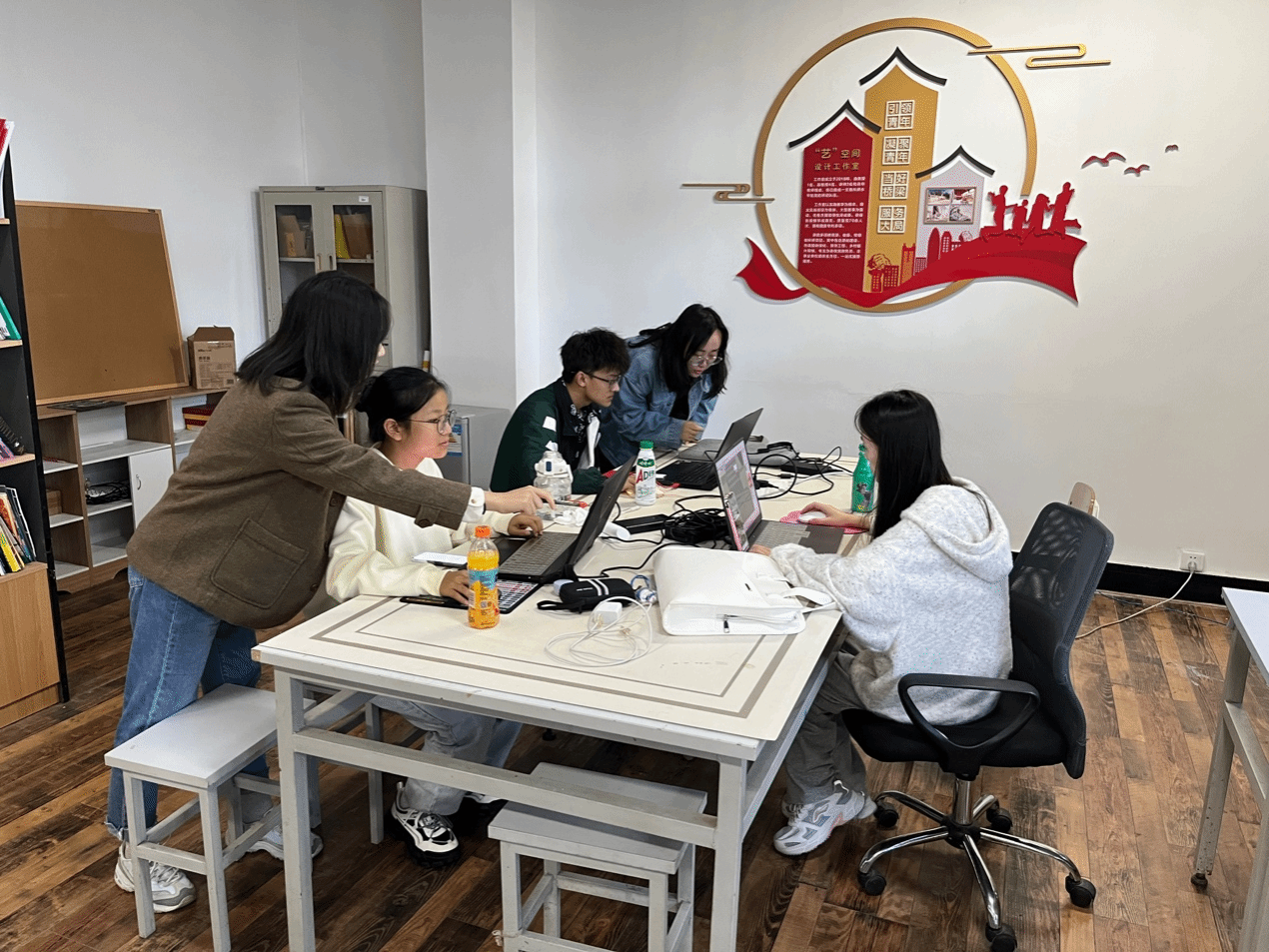 蕲春气象局新建办公楼景观设计项目,是“艺”空间名师工作室的一项重要的产学研合作项目。在“艺”空间名师工作室负责人付知老师的领导下,孙朝旭、程之韵、柯鑫三位老师全力投入,为学生们提供了宝贵的实践学习机会。在这一周的时间里,老师们不仅手把手指导学生参与实践,还时刻关注学生们的工作进展,为他们提供切实可行的指导意见。艺空间名师工作室负责人付知老师热心地为产学研项目参与师生点饭订餐,送上饮料,大家也干劲十足,一片红红火火。