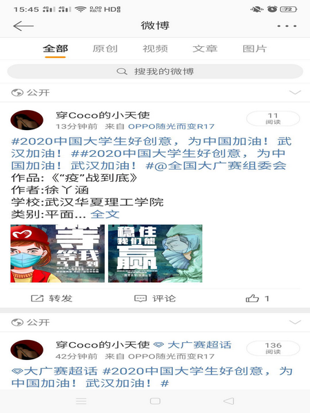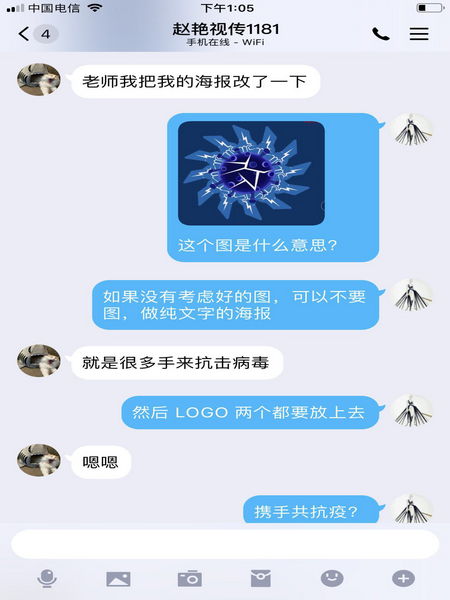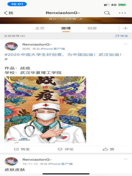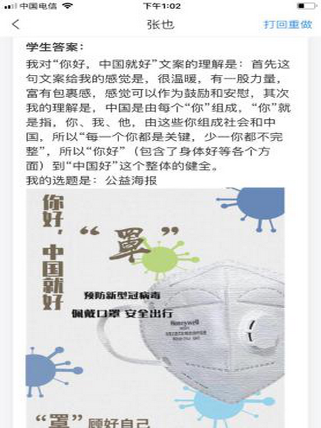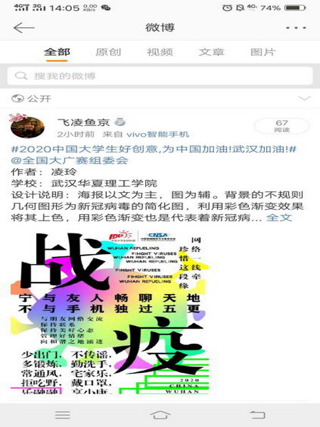 作品完成后,指导学生把作品上传到微博。课程中,方立立同学说,通过这次疫情,让她真切地感受到:哪有什么岁月静好,不过是有人替我们负重前行。王可儿认为,这场战疫让我们失去了很多同胞,我们更应该去支持那些还在自己岗位上奉献的人。视传1181班的学生借广告作品传递当代青年积极 的生活态度以及与全国人民共同战疫的决心。