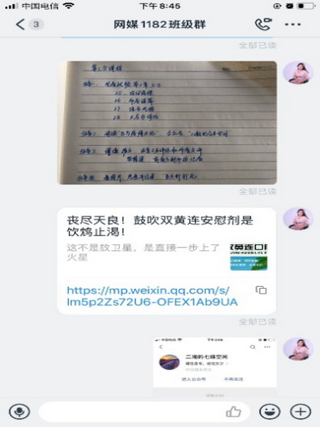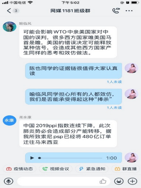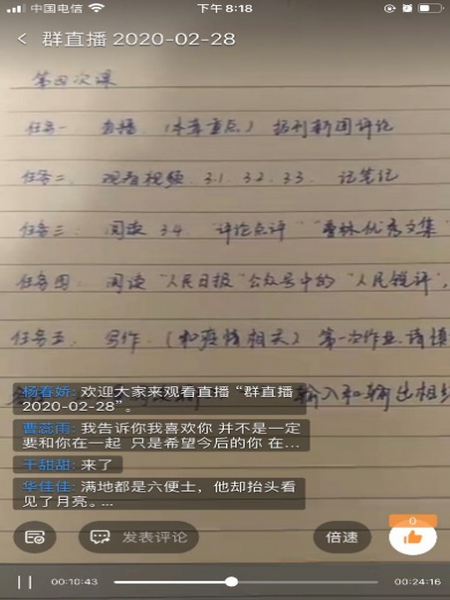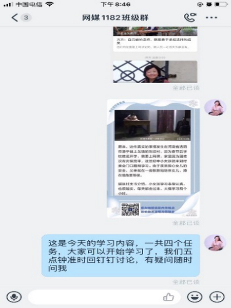 《网络新闻评论》一共由三个班,采取分班教学的形式,这样更有利于老师于每一个同学互动。提升教师的“存在感”,有利于师生间的“强关联性”,争取每个学生的名字都能出现在屏幕上,以提高学生的学习积极性。在具体教学上采取的是“钉钉直播+超星录播”,超星是为了建设完整的教学体系,保证教学大纲和重点知识的完成;钉钉作为直播平台,是对难点的讨论和知识结合理论的再扩展。