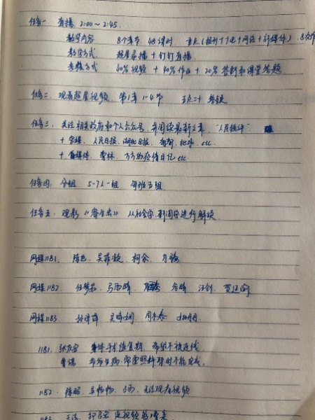 《网络新闻评论》每周两次课,每次4节课。一般情况下,每节课是四到五个任务,包括“直播(30min)+观看超星视频(60min)+阅读材料(25min)+新闻事件解读(20min)+课后讨论(45min)”。新闻教学必须结合实际,疫情便是最好的教材。具体形式可参照下图,基本按照教学日历进行。