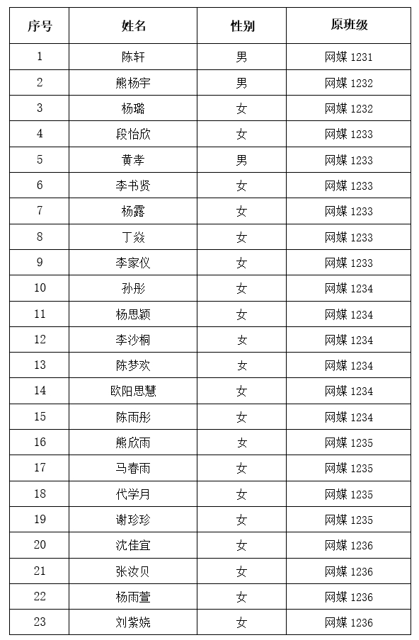 根据《艺术设计与传媒学院网络与新媒体专业卓越人才实验班分班实施细则》等相关文件要求,本着公平公正公开的原则,经本人申请,参加笔试、面试选拔,并综合考虑大一学习表现等因素,2023级网络与新媒体专业卓越人才实验班(网媒1237班)共选拔23名学生。现将录取名单公示如下。