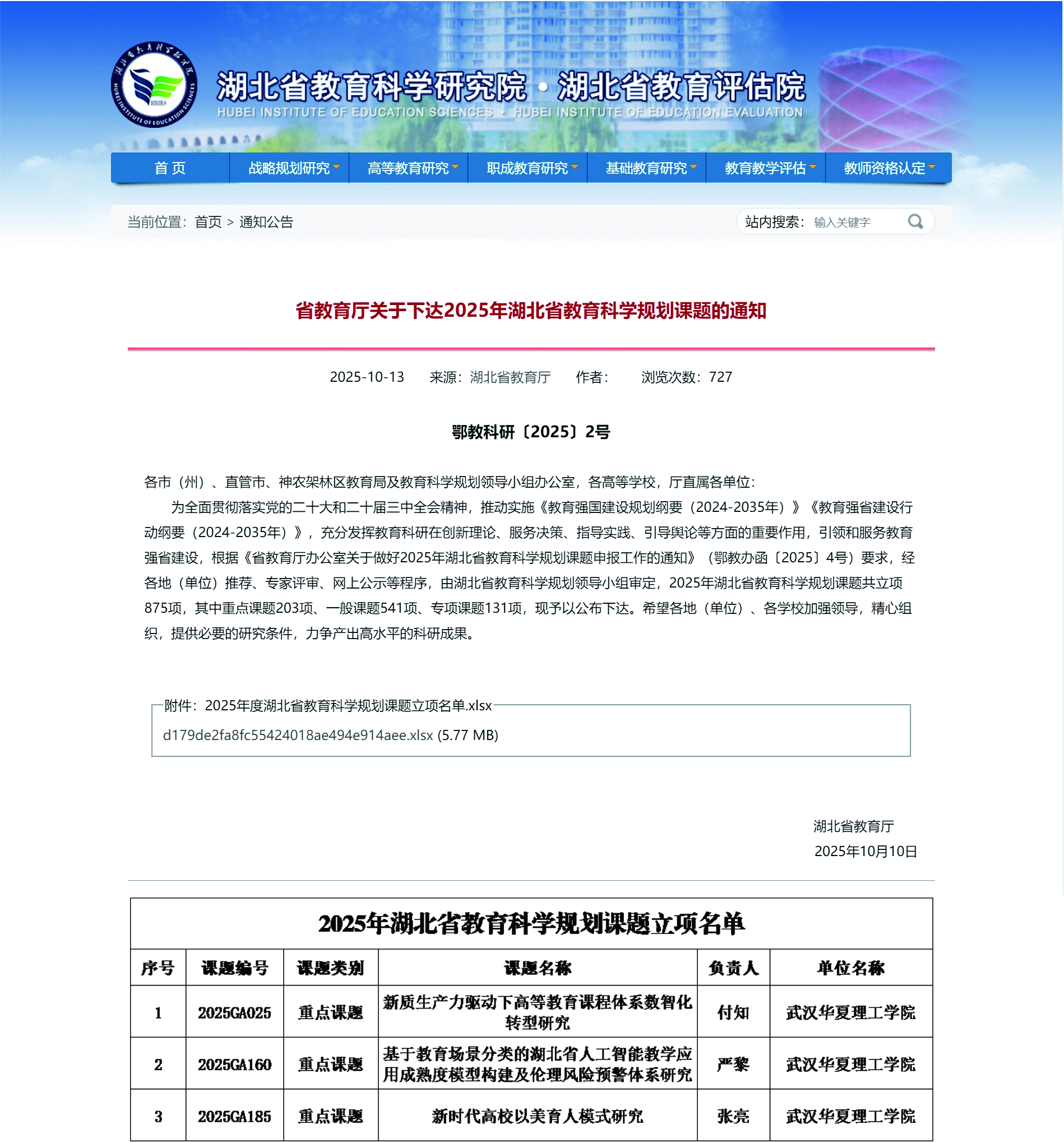 10月13日,省教育厅发布2025年湖北省教育科学规划课题立项通知,我院付知主持的《新质生产力驱动下高等教育课程体系数智化转型研究》、严黎主持的《基于教育场景分类的湖北省人工智能教学应用成熟度模型构建及伦理风险预警体系研究》、张亮主持的《新时代高校以美育人模式研究》获批重点课题,立项数量、级别均实现学院历史突破。