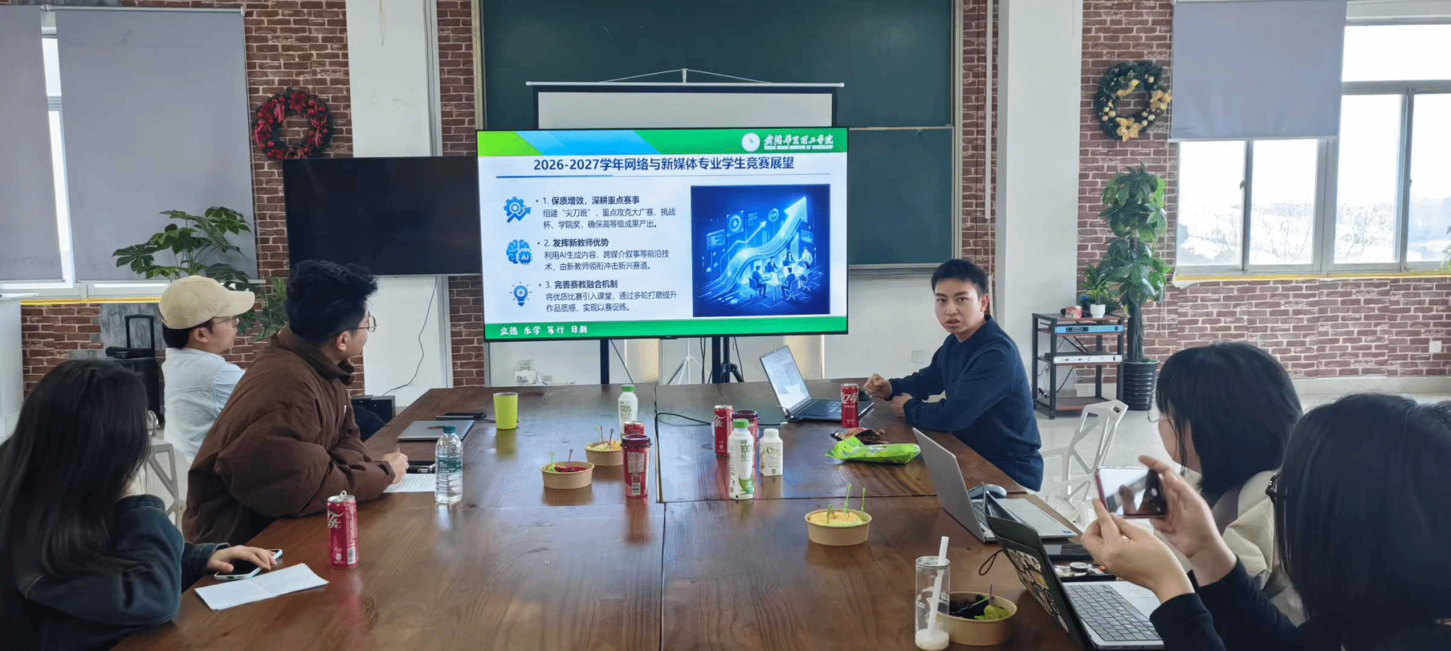 会议伊始,各工作室主任聚焦2025年度竞赛成果与工作室整体运行状况依次进行了精炼而充实的年度汇报。首先,网络与媒体工作室主任王淼汪洋介绍了在数字内容创作与跨媒体传播领域的探索及获奖情况。随后,产品设计工作室主任朱琦展示了工作室在实体产品创新、用户体验研究方面的突出项目与竞赛佳绩。广告设计工作室主任童瑶汇报了品牌传播、创意营销方面的实战成果与行业合作进展。环境艺术工作室主任吴天呈聚焦空间设计与景观营造项目,分享了在可持续设计理念下的实践。视觉传达工作室主任姚田阐述了在品牌视觉系统、动态图形等领域的深耕与竞赛突破。最后,数字媒体艺术工作室主任赵逸汇报了在交互艺术、虚拟现实等前沿领域的教学成果与创作获奖。