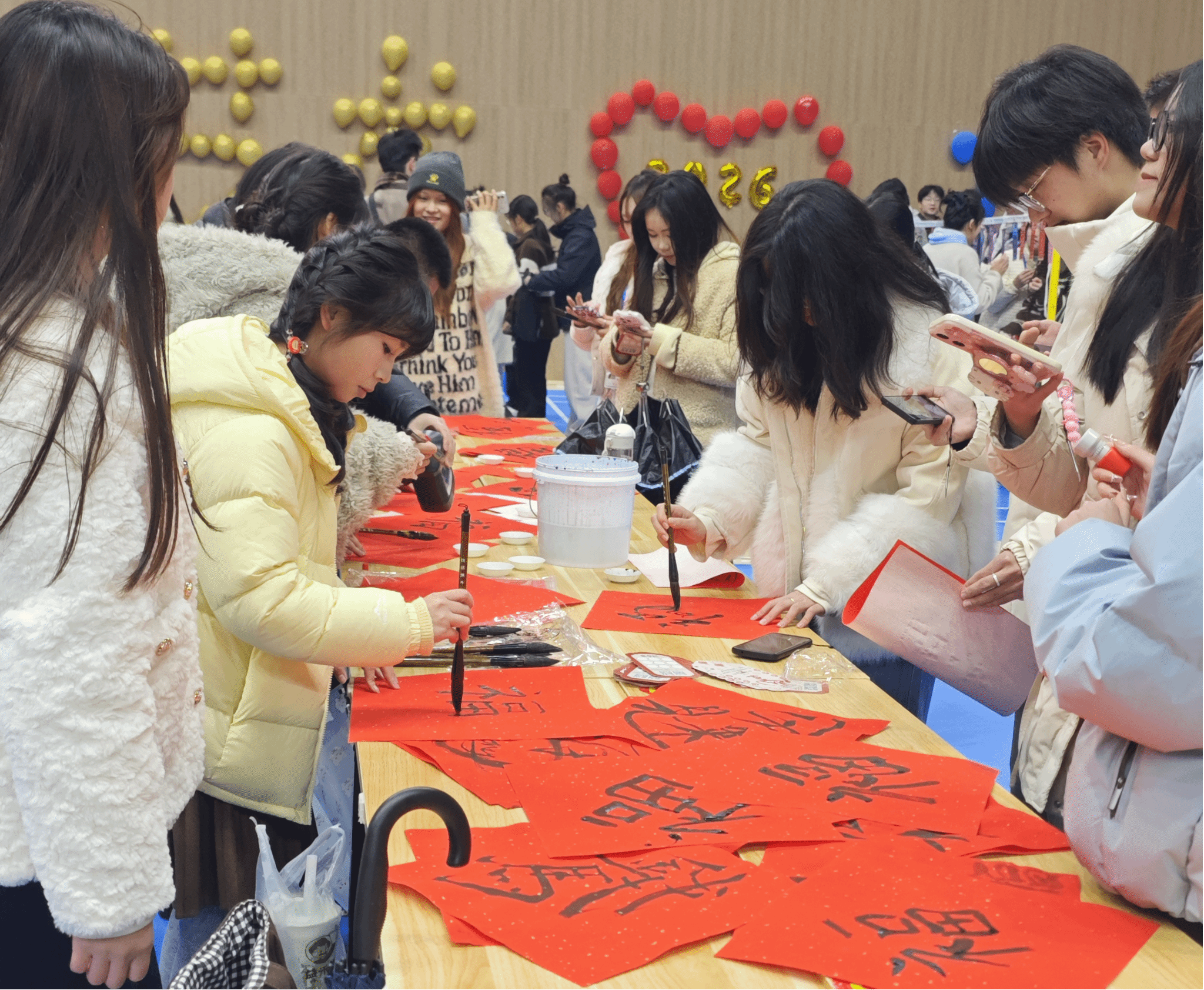 “翰墨迎春”书写区内,墨香萦绕。同学们在专业指导下提笔挥毫,篆、楷、行书各展其韵。一幅幅蕴含祝福的春联和“福”字在笔尖诞生,不少同学将作品带回装点宿舍,让传统年味在生活空间中延续。
