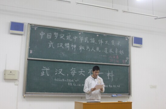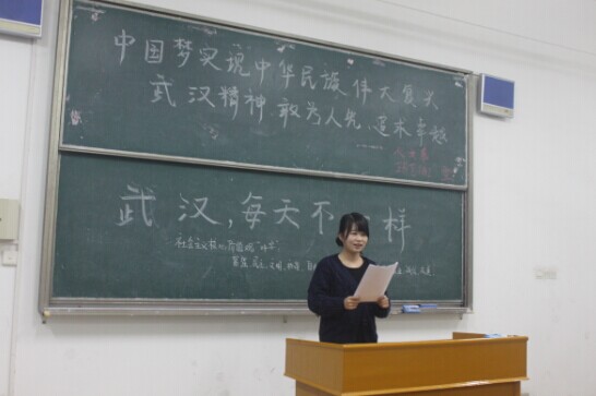 围绕着“文明武汉”这个大活动主题,各个班级组织了以“武汉城市形象口号”“中国梦”“武汉精神”等不同角度展开了特色主题班会。在广告1141班与网煤1141班,大家以抽签的形式来让读《文明武汉 文明校园》这本书,每个人在读的过程中,都可以进一步的加深和理解创建文明武汉的内容,接下来同学们又以问答的形式来学习“社会主义核心价值观”的内容,在短时间的强忆下,大部分同学都可以完整的说出来。在环艺1142班,班长组织同学们进行以“中国梦”为主题知识竞赛活动,提问各种围绕“中国梦”的问题,包括“中国梦”的内涵和提出人等一些问题,同学们积极踊跃地参加了这次知识竞赛,通过这次竞赛,同学们了解到更多关于“中国梦”的理解,弥补了平时一些大家忽视的内容。
