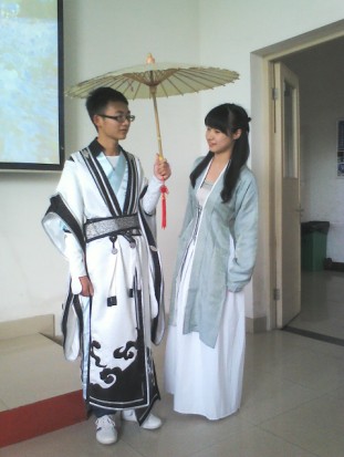 下午16时左右,参演话剧的同学们早早就在教室里做好了一切准备,经过多日的训练彩排,今天终于要正式演出了。演员、服装、化妆、背景、音乐、旁白……一切到位。由于是古风话剧,同学们还精心地化了妆穿了古装,力求让演出更有意境。