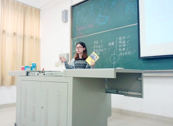 第一个登台的是名为“PencilFour”的小组,组员为四名女生。她们以“文艺男神”张嘉佳的《从你的全世界路过》为分析对象,从“其书”、“其人”、“其博”、“其火”等四个角度进行了分析。期间四个人轮流上台讲解,讲解中,为了展现该书的风格,四个女生或文艺或卖萌,调动了班上师生对书籍的兴趣,被带到的课堂上的该书也引得大家争相翻阅。