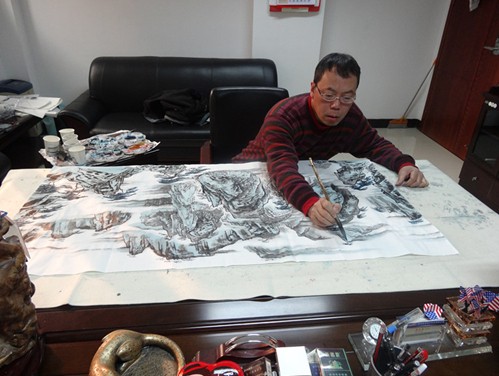 接下来,周老师在这张宣纸上挥毫泼墨,演示国画的知识和技巧,一边进行技巧说明,一边完成了一幅国画作品。其中,由那位学生和我先后留下的不好看的最初几笔,居然成为了作品中众多元素里的一种,增加了某种对比和变化的美。画面的视觉冲击力,引起了学生们的赞叹,一位女学生说:“连这么因难的画面都能画得这样不同凡响!”一堂生动的国画课在同学们的惊叹中结束了。