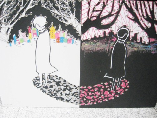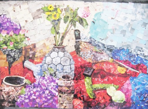 本次画展的主体为《设计色彩》的课程作品。从展览作品中,大家可以看到学生丰富的想象力,表现手法各有千秋;有用废旧杂志拼贴的马赛克组画,色彩艳丽;有结合传统工艺的装饰画,精致细腻;也有结合空间构成的立体作品,富有感染力。