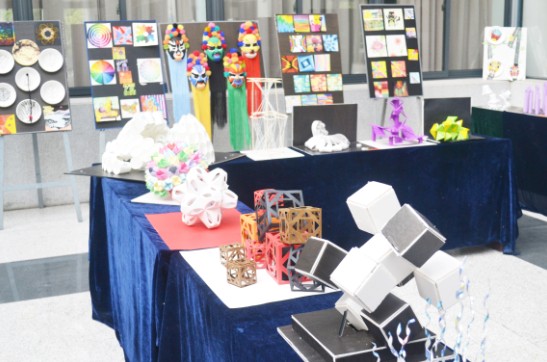 再来看看大一同学们的作品吧!此次将色彩构成与立体构成的课程作业集中展览了,他们的作品虽然看起来还有些稚嫩,但也不失令人喝彩的亮点。色彩构成的展区内,那些绘制细腻的图形,色彩绚丽而丰富,都可以直接挂在房间里当作装饰了;还有彩绘的圆盘,也让人爱不释手。在立体构成展区,虽然布展不久,就引来其他同学好奇的围观,大家对这些点、线、面、体的组合出来的三维形态感觉很新鲜,有一个造型特别的正12面体,每个经过的同学都会忍不住看一下,相信完成这件作品的同学看到这种情况也会很有成就感吧!还有一个立体的“俄罗斯方块”,不由得让人想起多年前风靡全球的游戏,还有用易位罐剪成金属细条,扭成如海藻般的螺旋,构成海底秘境的模样,充满巧思,让人眼前一亮……