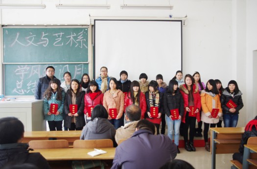 12月30日中午,在1-108教室,人文与艺术系举办学风建设月总结大会暨最美读书笔记、最美手绘作品颁奖典礼。人文系学工办主任刘静老师,团总支书记刘浩波老师、11级辅导员崔飞老师,12级辅导员付知老师、13级辅导员刘旭延老师、王超老师出席典礼。
