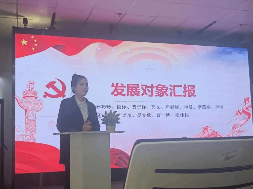 本次会议由惠铃老师主持。会议开始,全体起立奏唱国歌,由惠铃老师开场讲解这次会议的主要内容。随后,由发展对象依次上台,分别围绕个人实际情况,根据前期的发展过程以及对未来的个人计划进行总结。大家主要根据自身理论学习情况、思想成长等展开讲述,同时也说明了各自的未来规划。