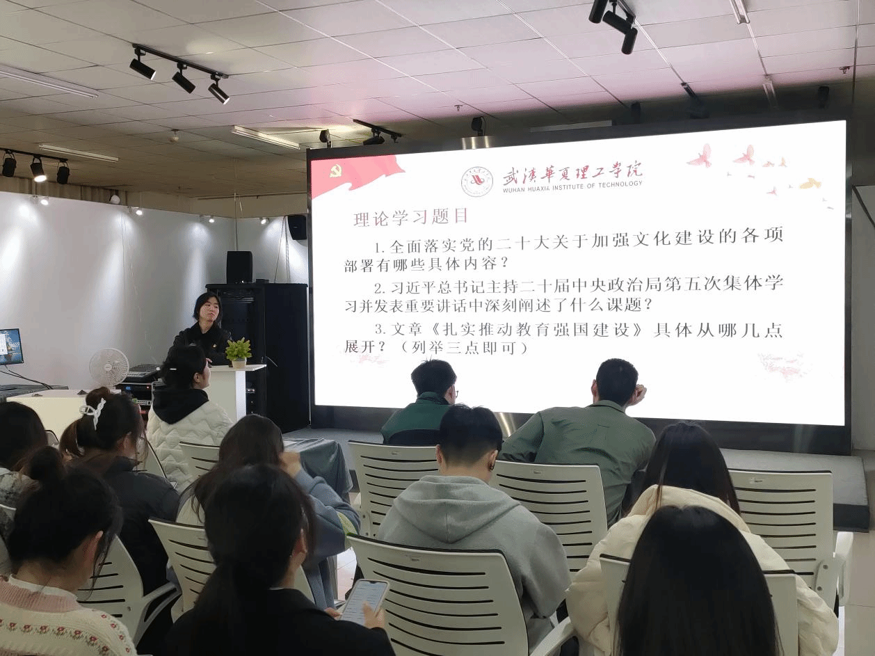本次会议由张兵主讲,围绕理论学习的多个方面展开讲述。首先,她从学习全国宣传思想文化工作会议精神方面进行阐述,关于全面落实党的二十大关于加强文化建设的各项部署。随后,张兵给大家分享了由中国共产党中央委员会主办的《求是》杂志中发表的习近平总书记重要文章《扎实推动教育强国建设》,她分别从“教育是国之大计、党之大计”、“加强党对教育工作的全面领导”、“落实立德树人根本任务”、“大力弘扬教育家精神”四个方面进行阐述。
