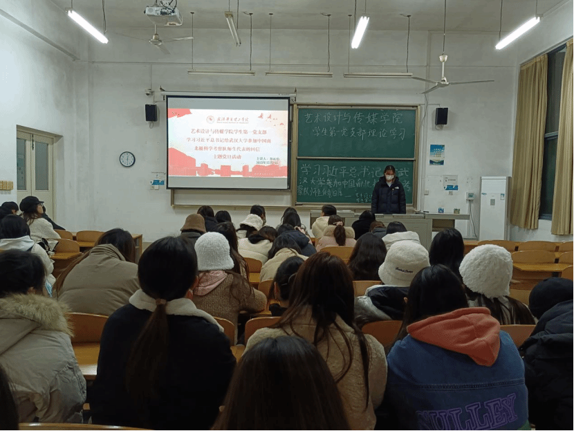 为传达习近平总书记重要讲话重要指示精神,增强学习的针对性和实效性。12月7日,艺术设计与传媒学院学生第一党支部全体成员在教室1-102开展了“学习习近平总书记给武汉大学参加中国南北极科学考察队师生代表的回信”主题党日活动。参加本次会议的有我院学生第一党支部书记惠铃、支委葛占洪老师、张浩琦老师,以及学生第一党支部全体成员。