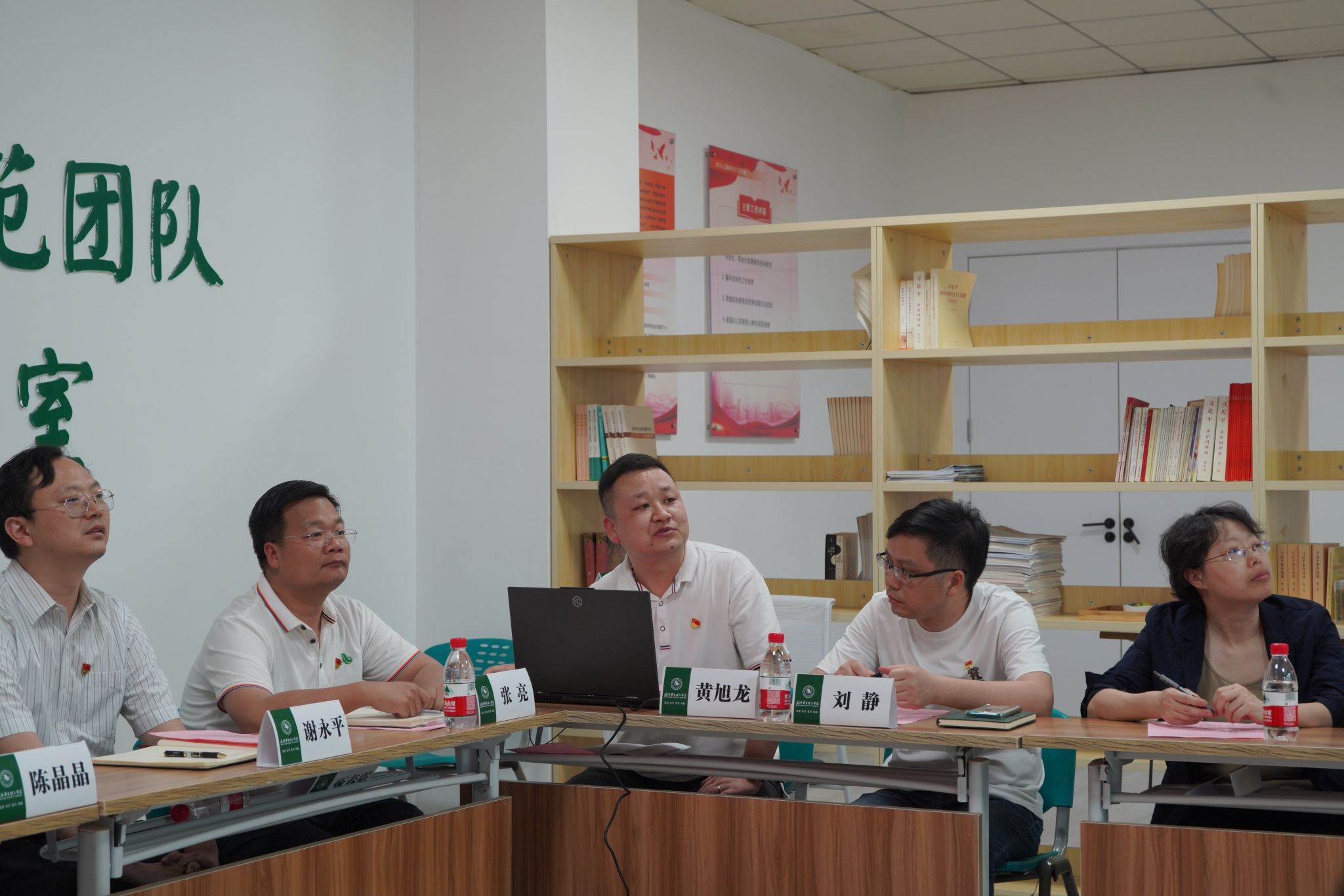 黄旭龙详细介绍了艺术学院省级标杆院系培育建设的具体情况。他围绕学院全面加强党的政治引领,强化体制机制创新。基于艺术设计与传媒专业特点,把党建引领、思政工作融入学院美育教育全过程,突出政治引领、培根铸魂为第一标准,以美育人、以美化人、以美润心、以美培元,重点深化了“遇见美•创造美•传递美”的党建引领特色美育育人模式,打造了“艺路有你•党旗红”党建工作品牌。