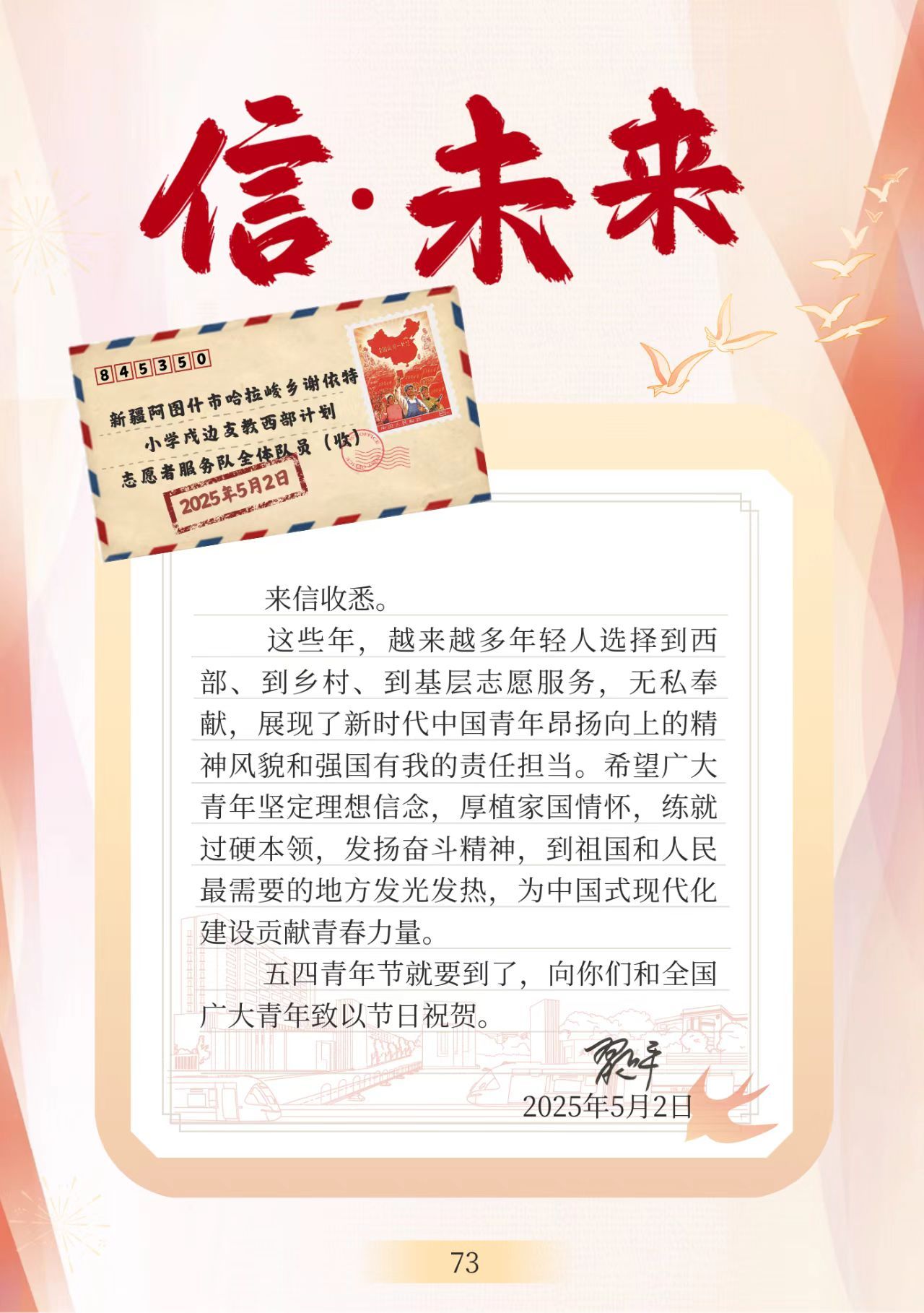 在五四青年节到来之际,中共中央总书记、国家主席、中央军委主席习近平给新疆克孜勒苏柯尔克孜自治州阿图什市哈拉峻乡谢依特小学戍边支教西部计划志愿者服务队全体队员回信,向全国广大青年致以节日祝贺并提出殷切期望。我院师生通过社区谈心谈话、主题宣讲等形式开展了集中学习。
