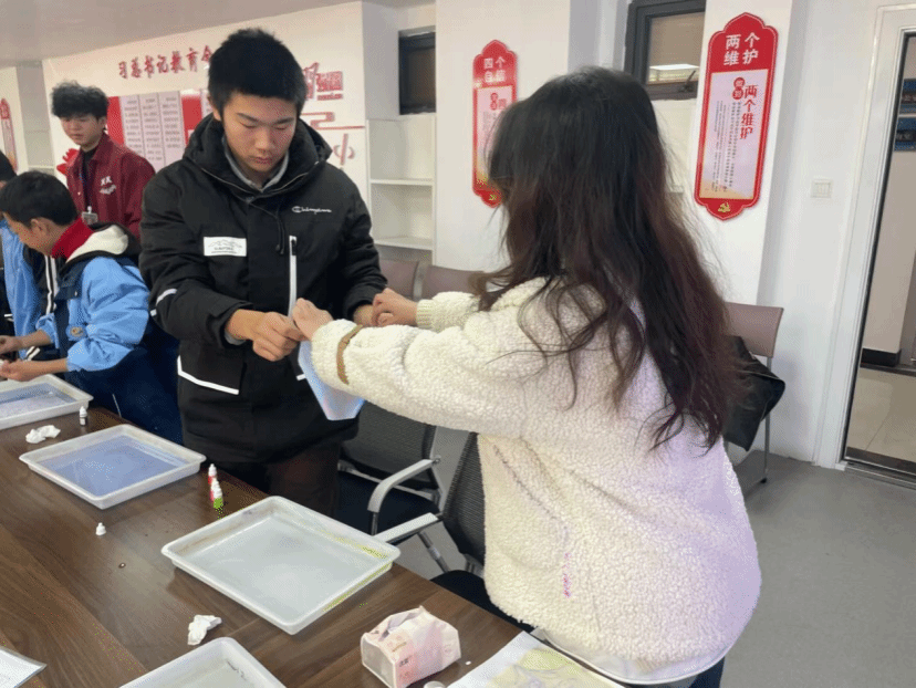 2024年12月22日上午,我院青年志愿者协会的志愿者们在武汉砺志中学开展了一场水拓丝巾非遗活动。本次活动主要为了丰富中学生们的课余生活,传承中华优秀传统文化,青协志愿者们走进校园,和学生们共同近距离领略了非遗文化的独特魅力。