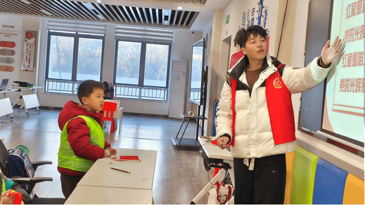 近日,我院学生志愿者走进惠民苑青少年空间寒假“爱心托管班”,开始了以“红歌润童心,精神永传承”为主题红歌传唱课堂,通过传唱红歌旨在让孩子们传承红色基因、铭记先辈奋斗、增强对国家和民族的热爱之情。