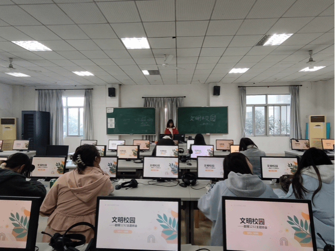 团支书张海笑通过PPT展示,向同学们讲解了校园中存在的一些不文明现象的图片和视频,如随手乱扔垃圾、在公共区域大声喧哗、破坏校园设施等,直观地让同学们认识到这些行为对校园环境和他人造成的不良影响。