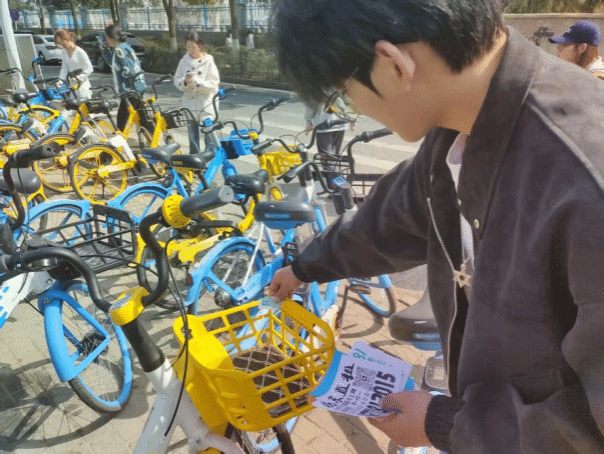 活动当天,同学们热情高涨,早早来到集合地点。在明确任务后,大家迅速分散开来,对路边停放的共享单车展开“清理行动”。这些共享单车为市民出行提供了便利,却也成为小广告的“重灾区”。小广告不仅影响车辆美观,还破坏城市形象。同学们不怕脏、不怕累,徒手或利用工具,仔细地将一张张顽固的小广告撕下,不放过任何一个角落。