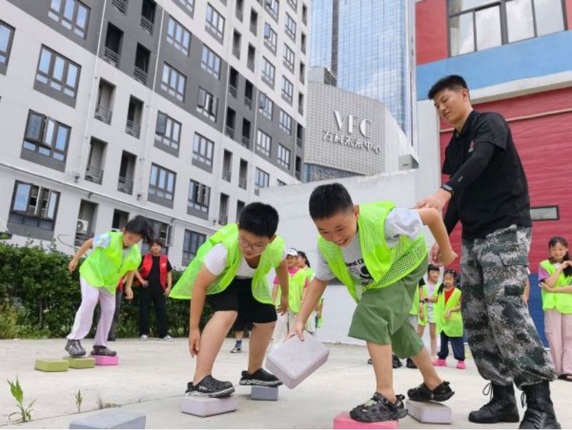 当日上午,家长们早早陪同孩子来到现场,在签到台完成登记,为孩子融入新集体做好准备。志愿者在社区指导老师的带领下,细致做好课堂筹备工作,为后续课程顺利开展筑牢基础。首堂军事体验课分为室内、室外两部分:室内训练中,教官一声“一二!”,孩子们便齐声喊出“立正!”,既锻炼了军事素养,也强化了课堂纪律;室外环节的两项团队游戏里,尽管天气炎热,孩子们依旧热情高涨,在协作配合与争分夺秒的比拼中锻炼自我。