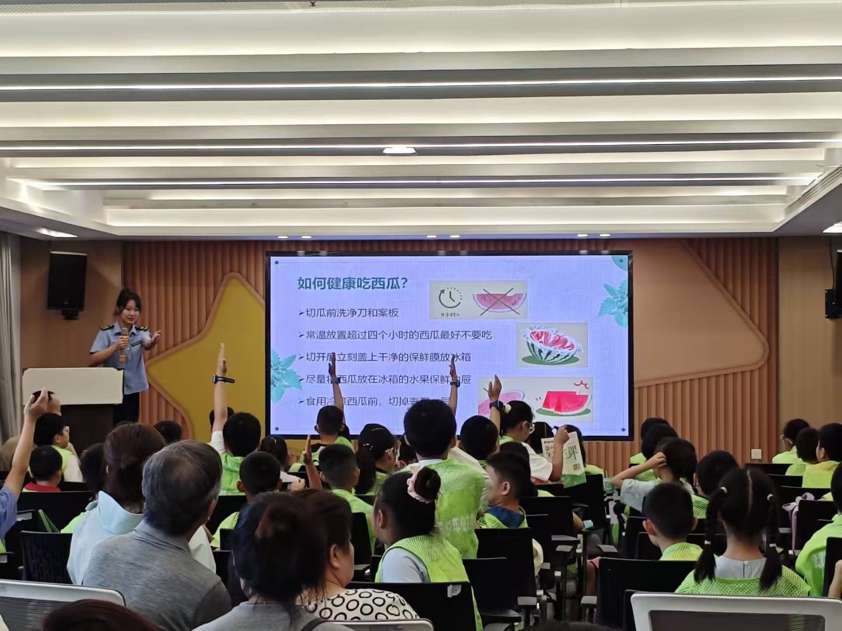 活动特邀汉阳区食品监管局工作人员进行食品安全科普。专家以日常饮食为切入点,提醒孩子们“隔夜西瓜易滋生细菌”“四季豆必须煮熟食用”,并通过实物对比和趣味实验,让孩子们直观理解食品变质的过程。小朋友们踊跃提问,“为什么牛奶不能放在阳光下?”“冰箱里的食物就不会坏吗?”现场气氛热烈,科普效果显著。