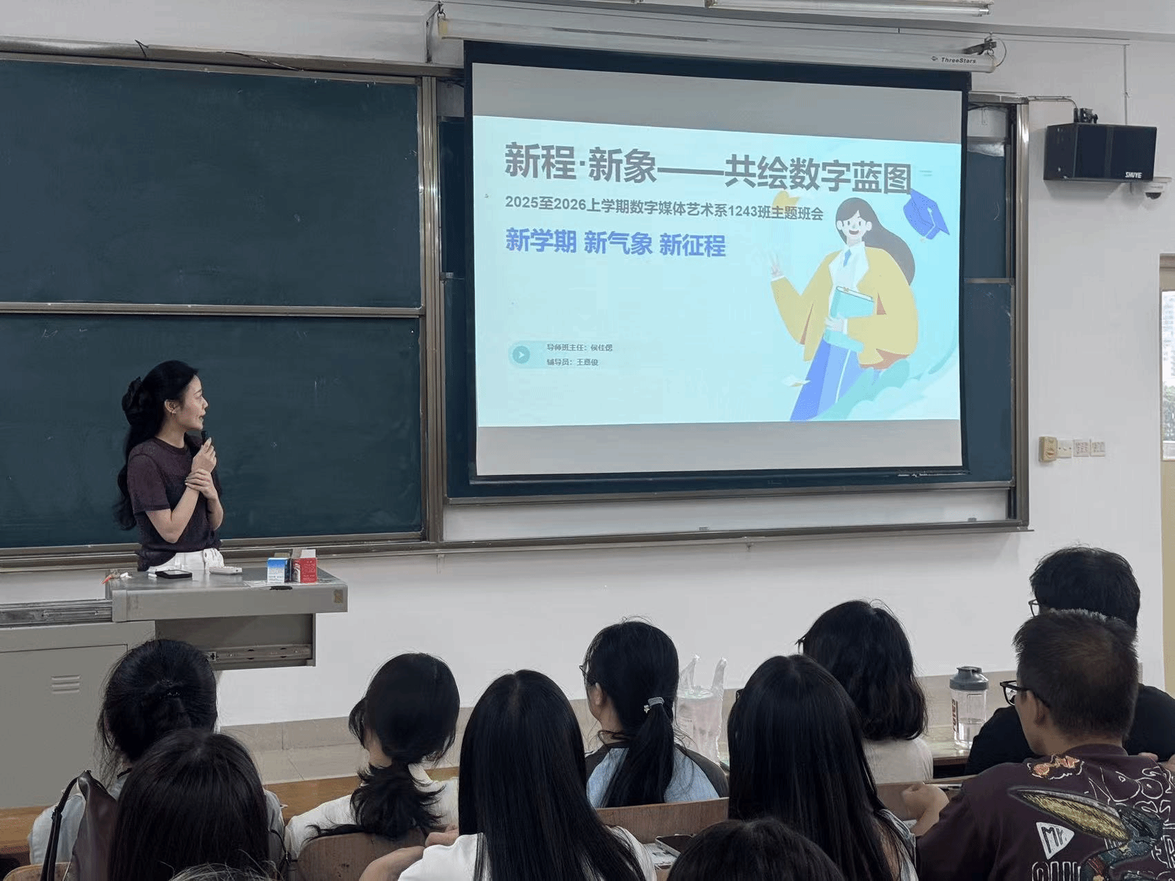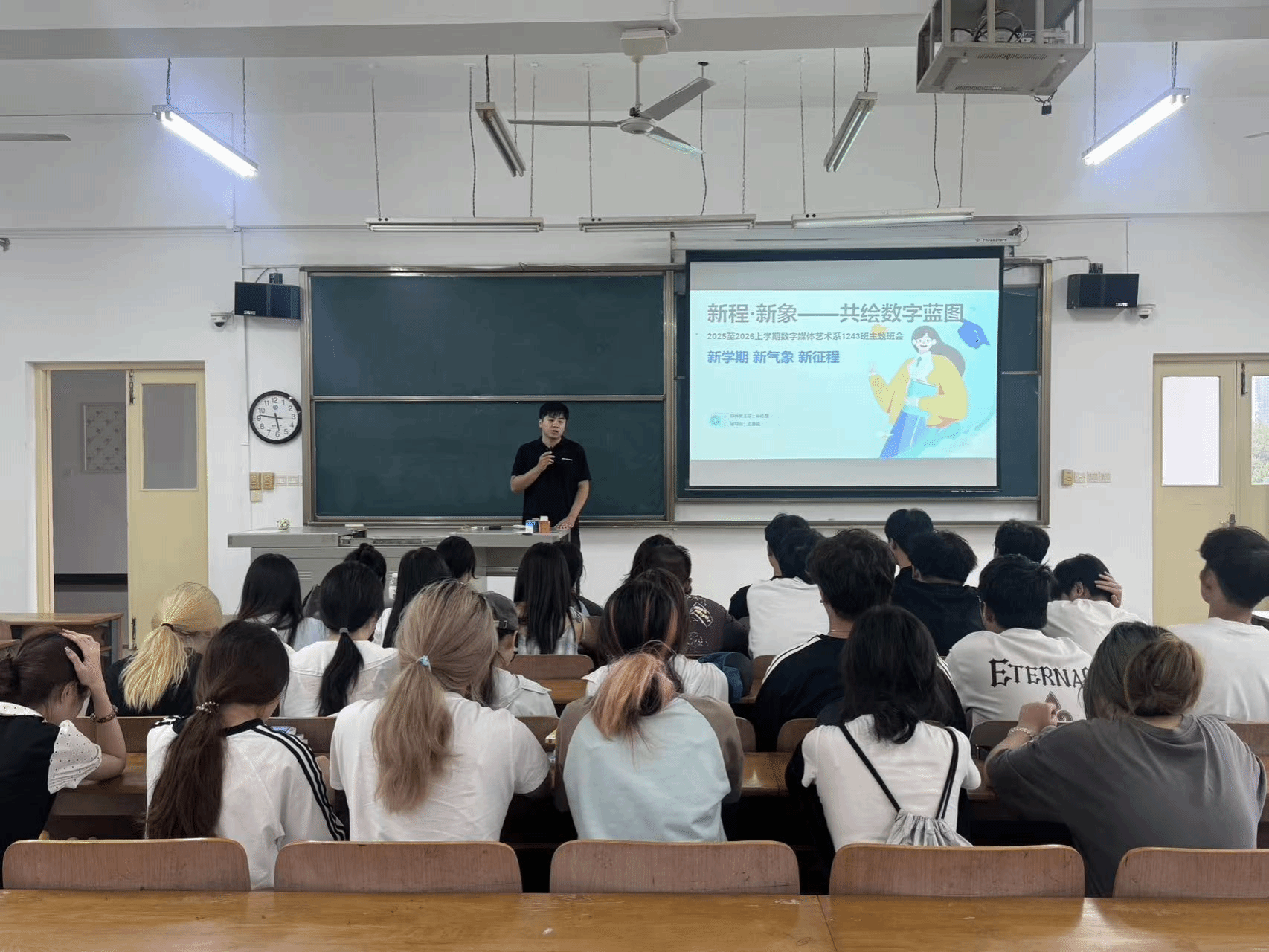 9月8日,数字媒体艺术系1243班召开“新程·新象——共绘数字蓝图”主题班会。班会由导师班主任侯佳偲老师、辅导员王嘉俊老师共同主持,全班同学积极参与。本次班会旨在帮助同学们明确新学期的学习方向与个人发展路径,凝聚集体共识,营造积极向上的班级氛围。