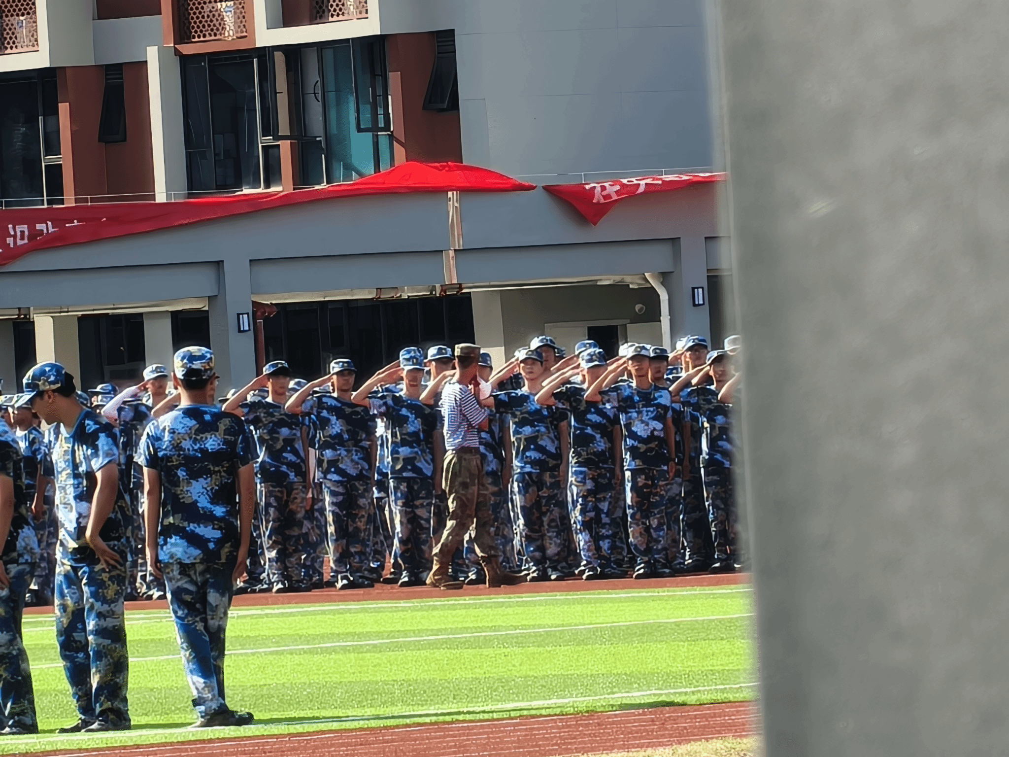 尽管训练期间偶有微风,但长时间保持站姿仍让不少新生额头冒汗,却无一人松懈。休息时,新生们自发结成小组,互相提醒动作要点;有的对照教官示范视频复盘不足,有的主动向动作标准的同伴请教技巧,训练氛围紧张又热烈。