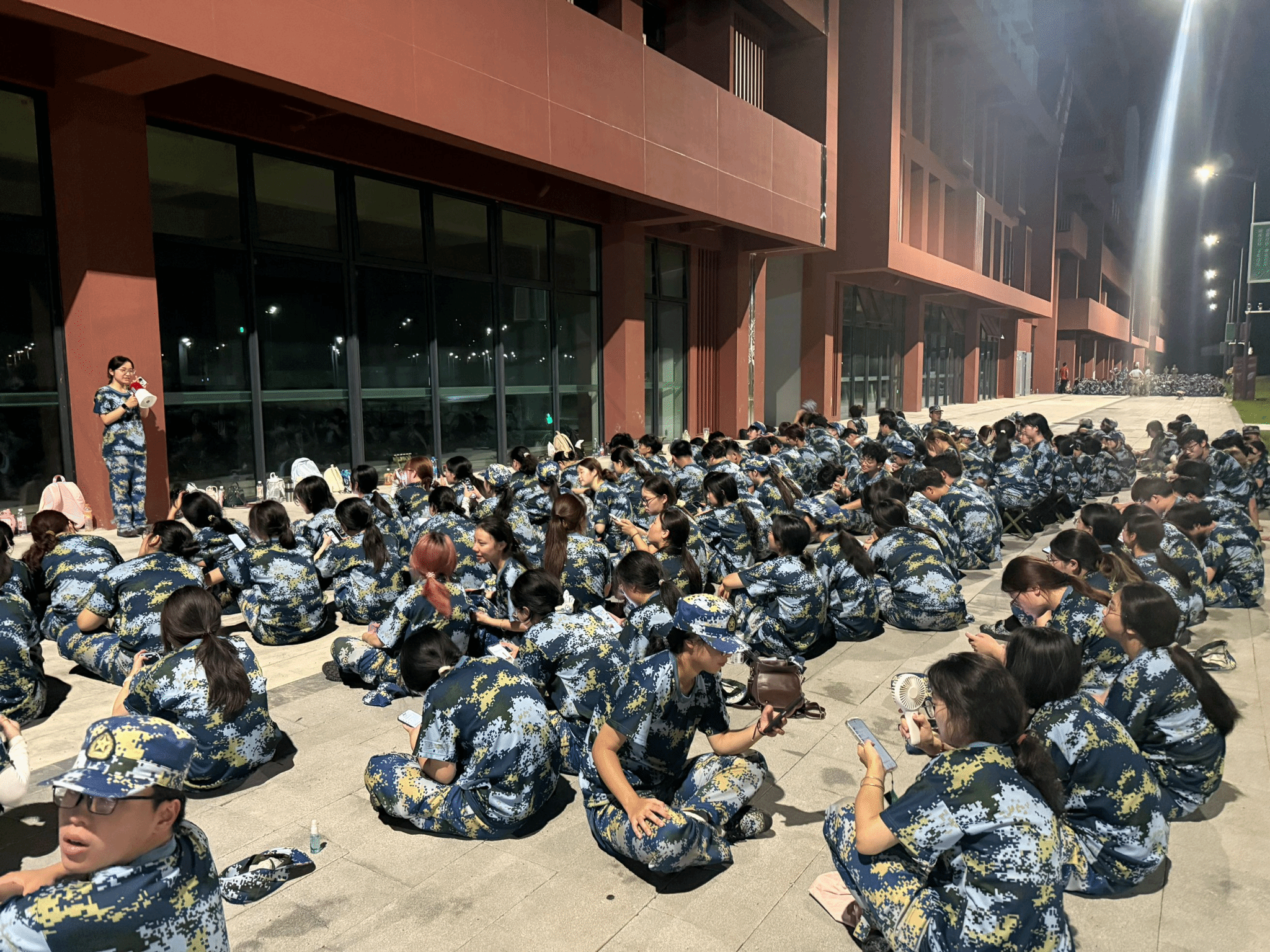在红砖建筑的映衬下,训练了一天的新生们虽略带疲惫,却难掩青春的活力。现场,一位教官手持扩音设备,正为大家开展军训心得分享与纪律强调。新生们或认真聆听,或相互交流,现场氛围既严肃又充满温情。