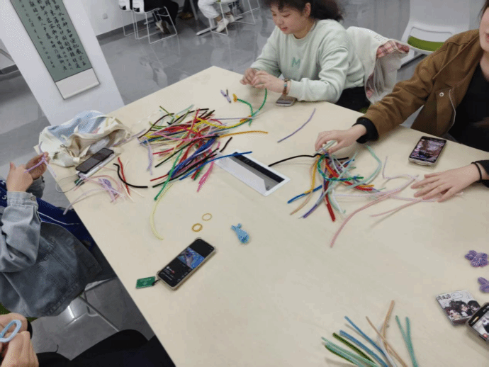 活动分为两个环节。首先是“扭扭棒创意制作”,同学们分组合作,用五颜六色的扭扭棒、剪刀、胶水等材料,充分发挥想象力与动手能力,陆续完成小动物、花朵、卡通人物、实用小摆件等各具特色的作品。大家相互交流技巧,分享创意,在轻松创作中增进彼此的了解与信任。