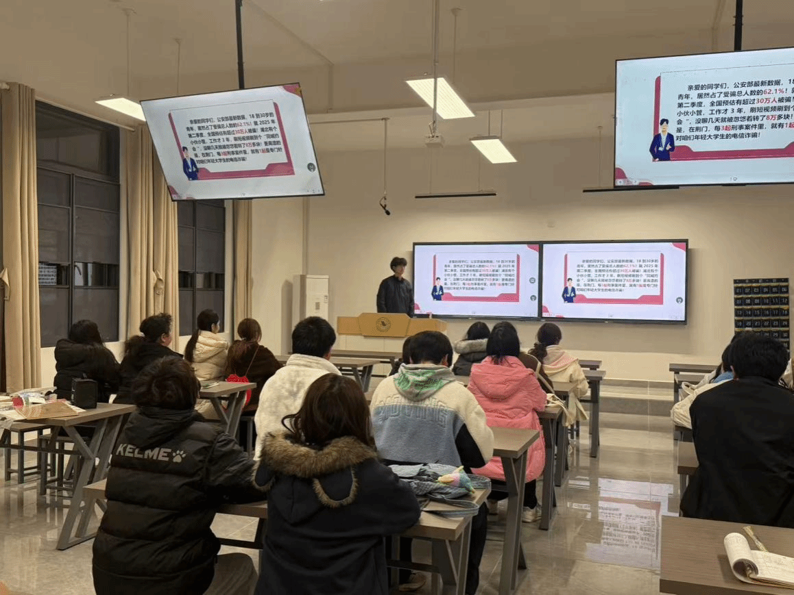 活动以“知识宣讲+情景实践+创意输出”三维模式展开,贴合青年学生认知特点。宣讲环节中,班级安全员结合近期校园高发网络诈骗案例,用生动鲜活的语言层层拆解核心要点:从虚假购物退款、刷单返利、冒充熟人借贷等传统骗局的网络变种,到游戏账号交易诈骗、AI换脸冒充亲友、校园贷升级陷阱等新型诈骗手段,再到“三不一多”反诈原则与国家反诈中心APP使用指南,系统讲解识别诈骗、规避风险的核心知识。宣讲穿插“反诈快问快答”,“收到‘中奖’链接要求填写身份证号该怎么办?”“AI语音冒充家长借钱如何核实?”等问题,引发踊跃抢答,在思维碰撞中巩固知识点,让反诈知识入脑入心。