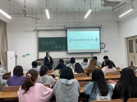 本次班会由导师班主任陈铭老师主讲,她首先从师资力量、课堂体系、课堂活动、就业方向四个方向为大家详细介绍了网络与新媒体专业,并向同学们讲述了近年来网络与新媒体专业的发展方向与发展前景。随后,为增进老师对同学们的了解,每位同学都做了自我介绍并详细阐述了个人对未来学习或就业的理解与期待。