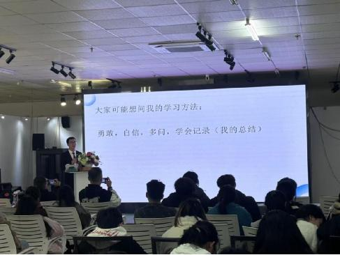 讲座开始,李振川首先做了一个自我介绍,这个自我介绍包含了他大学四年来所获得各项比赛奖项以及个人职务,其中还包含了两年当兵的经历,当兵的时候也得了奖,履历可谓是相当之丰富。随后他便向同学们讲述了自己的学习方法,那就是三“多 ”,多记录,多练习,多询问,这些都能有效的帮助个人进步。