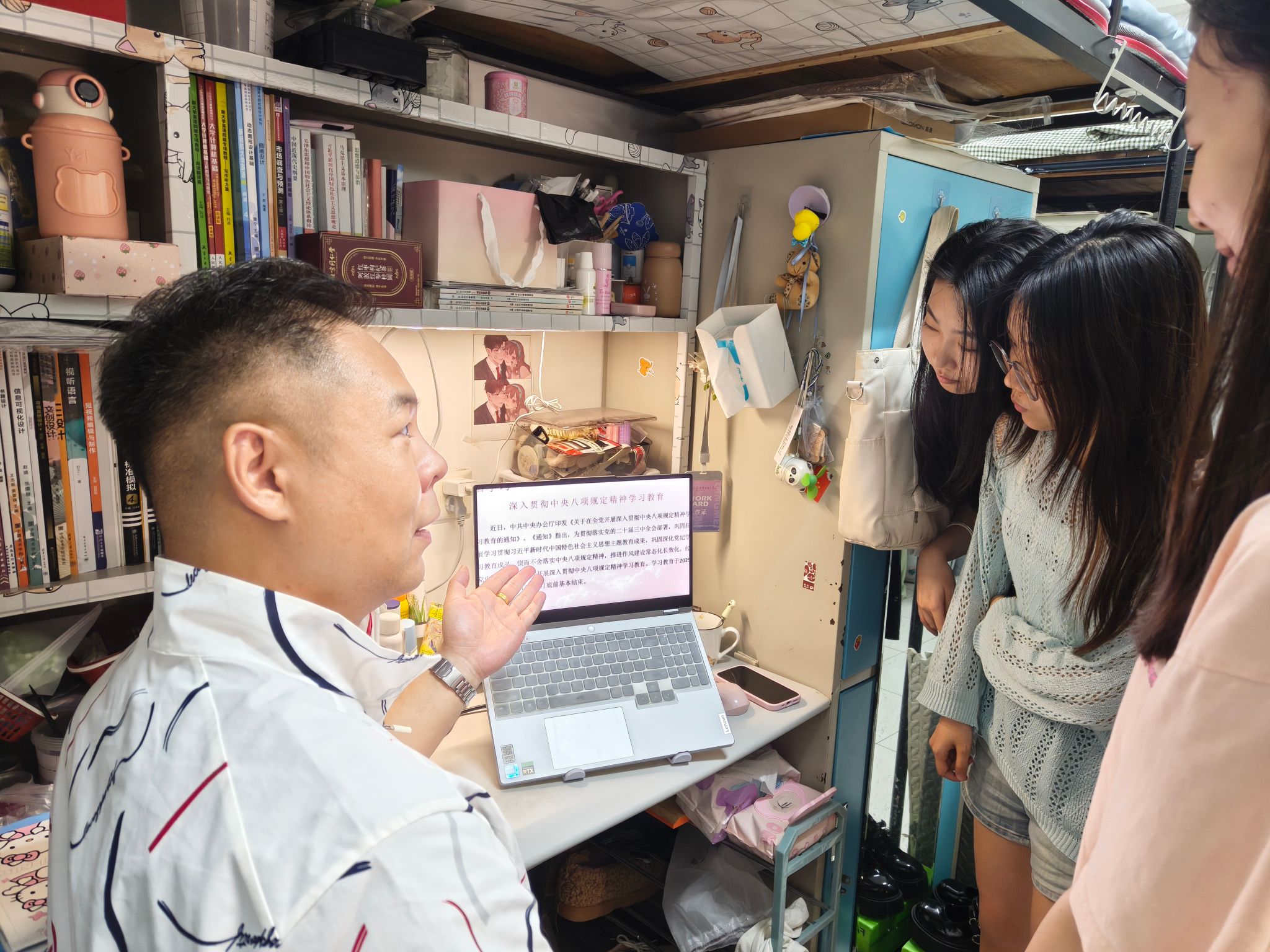 活动中,辅导员们采取“宿舍微课堂”的形式,用通俗易懂的语言解读中央八项规定精神的核心要义。在视觉传达设计专业学生宿舍,辅导员韩老师结合专业特色,通过设计“纪律红线”创意海报的方式,帮助学生理解“厉行节约”“反对浪费”等要求;在环境设计专业宿舍,马老师组织学生围绕“校园文明行为规范”开展小组讨论,引导学生将理论学习转化为日常行为准则。