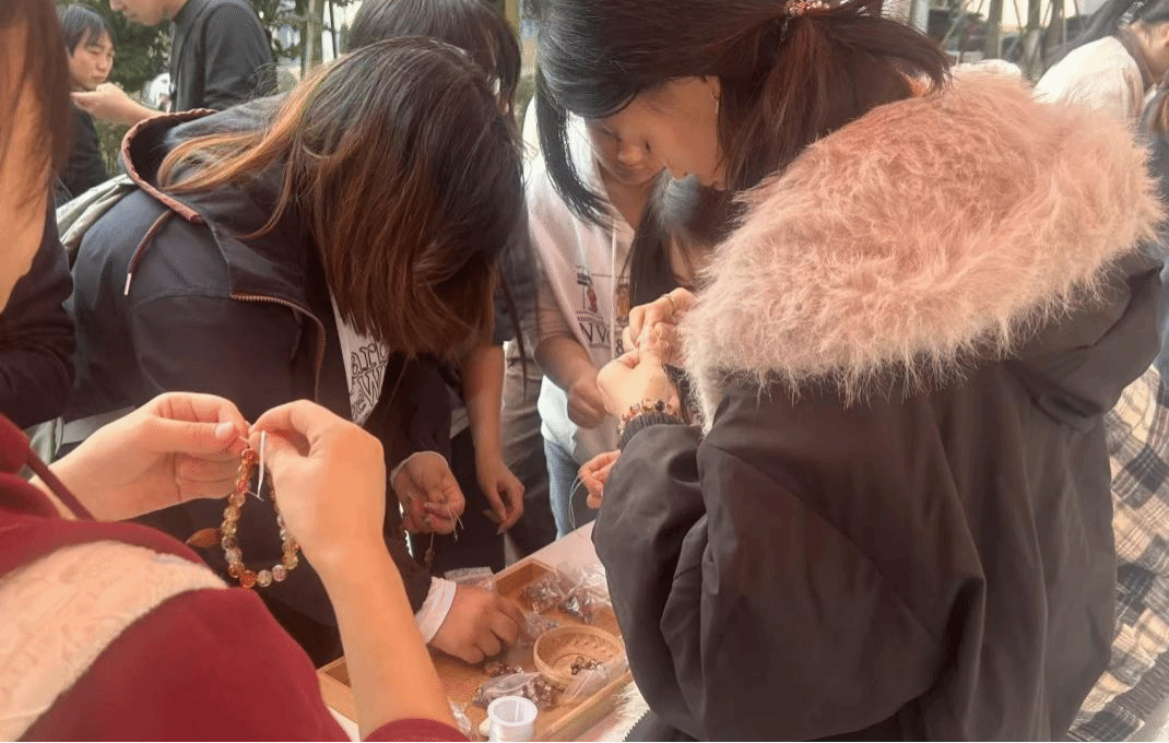 中药手串制作区域同样备受青睐。在焦洁老师的帮助下,同学们通过选材、打磨、串制等工序,将沉香、檀香、决明子等中药材精心编制成药香萦绕的手串。这一过程不仅让同学们了解了中药材的特性,更深刻体会到本草美学与养生智慧的千年传承。