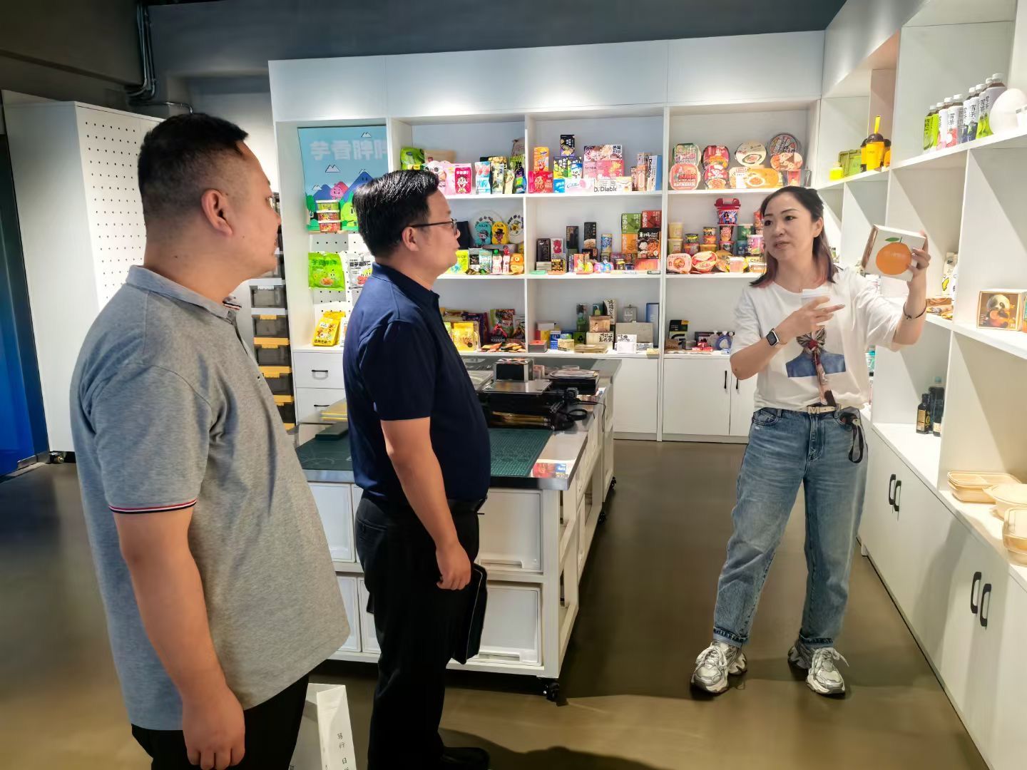 在浪尖设计集团,张亮在公司高总监的陪同下参观了农产品智慧流通工业设计研究院,详细了解了以全产业链设计创新赋能农产品流通的标准化、农产品交易的数字化和农产品数物融通的智慧化平台建设情况,并就学院现有专业融入研究院工作流程、毕业生职业素养和技能支持上做了深入交流。