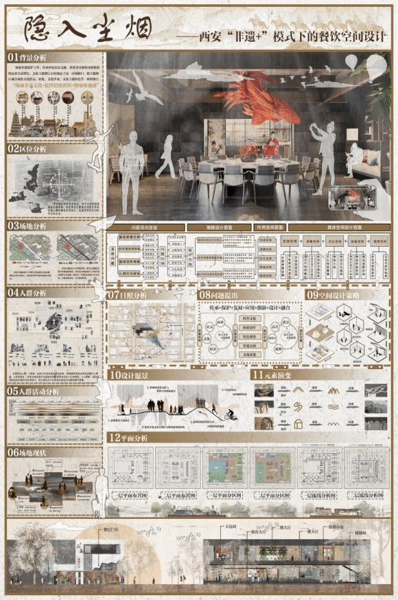 本次荣获国家二等奖的作品《隐入尘烟——西安基于“非遗+”模式下的餐饮空间设计》将西安非遗元素融入餐饮空间设计中,通过空间设计,将这些故事以视觉艺术的形式展现出来,通过餐厅的装饰、布局将有代表性的非遗元素融入其中,如设置非遗文化体验区、非遗文化墙、展示传统手工艺制作过程等,使顾客在用餐过程中了解并传承这些宝贵的文化遗产,为顾客提供提供情绪价值,增加用餐的增加松弛感。