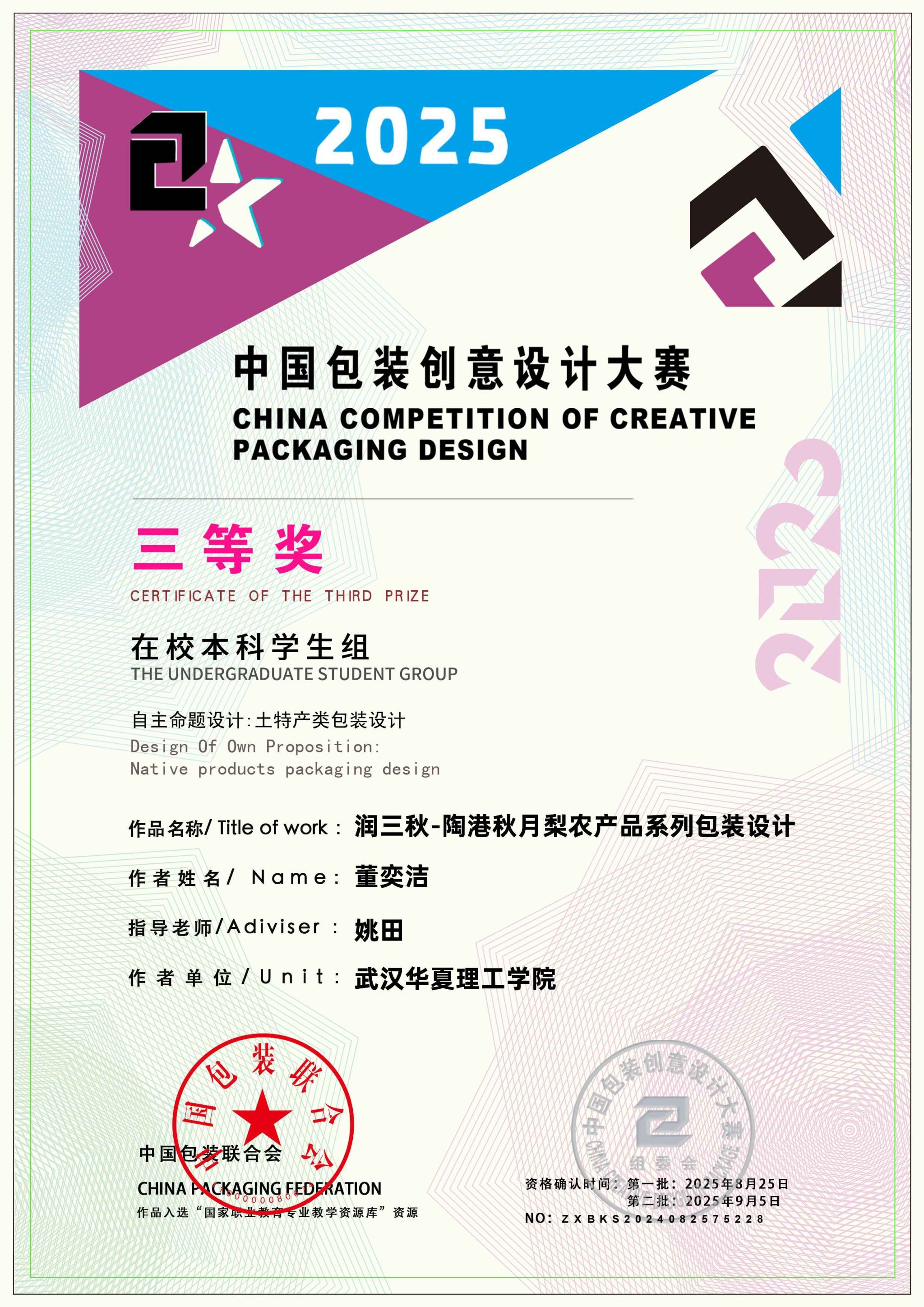 近日,中国包装创意设计大赛全国总决赛结果正式揭晓,我院视觉传达设计专业学生凭借作品《润三秋 — 陶港秋月梨农产品系列包装设计》脱颖而出,成功斩获全国三等奖,充分展现了beat365在艺术设计人才培养与校地协同创新领域的显著成果。