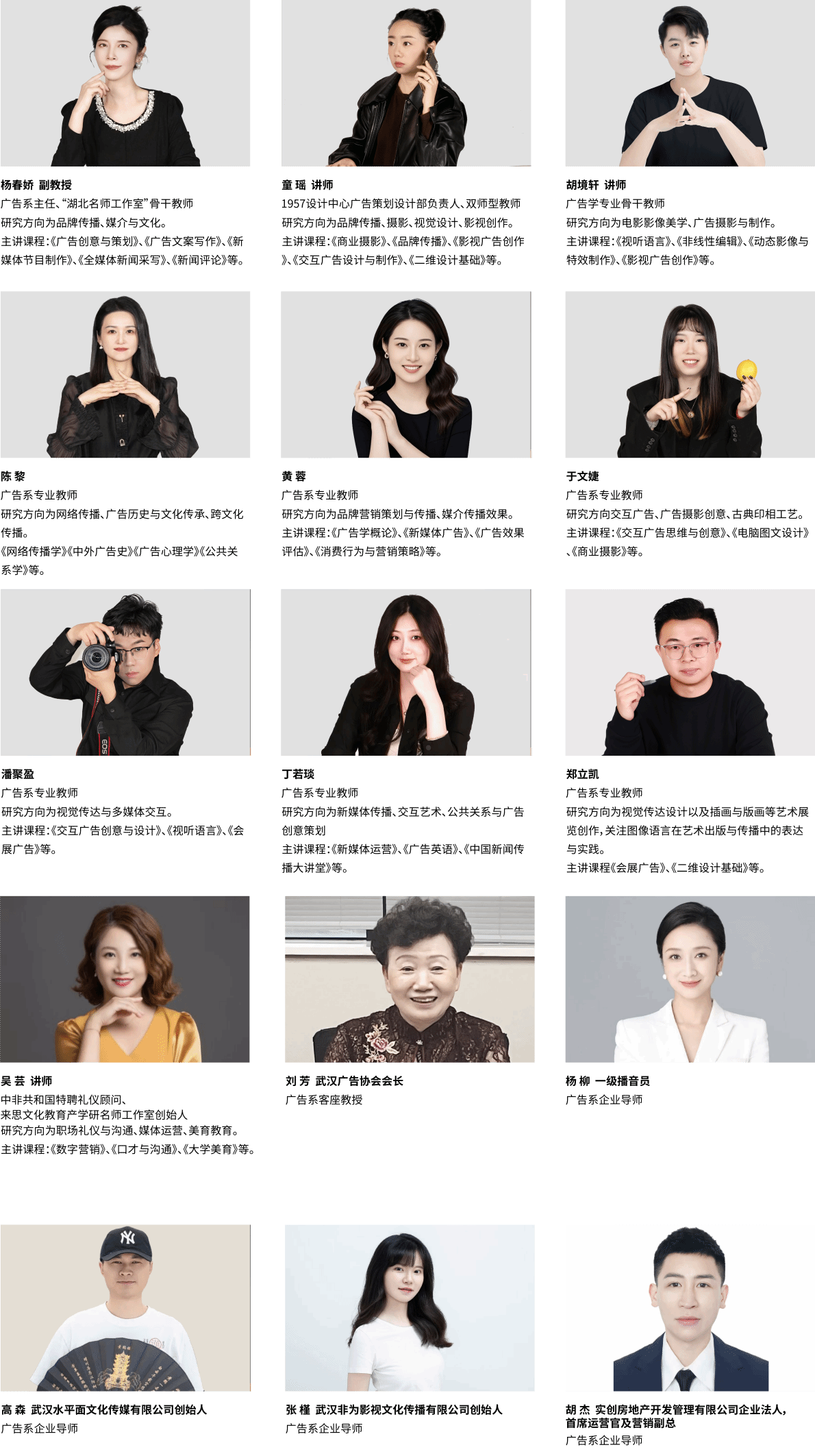 广告学专业教师团队是一支教学水平高、学缘与职称结构合理的“双师型”教师队伍,兼具扎实的理论功底与丰富的行业实践经验。团队中多名青年教师曾任职于地产公司、知名互联网企业及国际4A广告公司,具备深厚的行业背景。杨春娇老师在湖北省教学创新大赛中荣获三等奖,展现了团队在教学研究与改革方面的积极探索与成效。