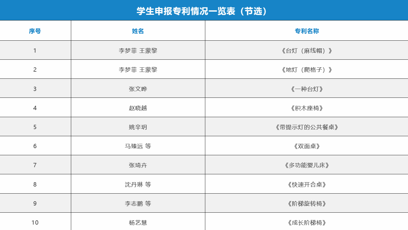 环境设计专业以室内外空间为设计对象,开设有家具设计相关课程。学生在课程过程中创造了大量构思奇妙、外观新颖、功能独特的产品。以此为基础,教师通过开设专利申请讲座、单独辅导等多种方式指导学生申报专利。