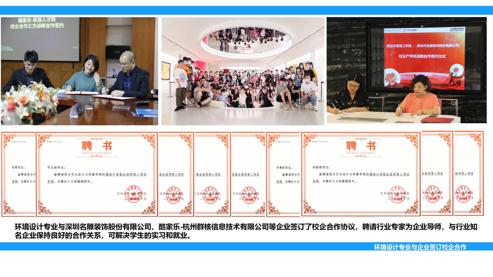 校外实践教学基地:共建有14个校外实习、实训和产学研基地,如浙江新中环建筑设计有限公司、深圳名雕装饰股份有限公司、武汉英拓景观设计有限公司、酷家乐-杭州群核信息技术有限公司等,与行业知名企业保持良好的合作关系,可解决学生的实习和就业。